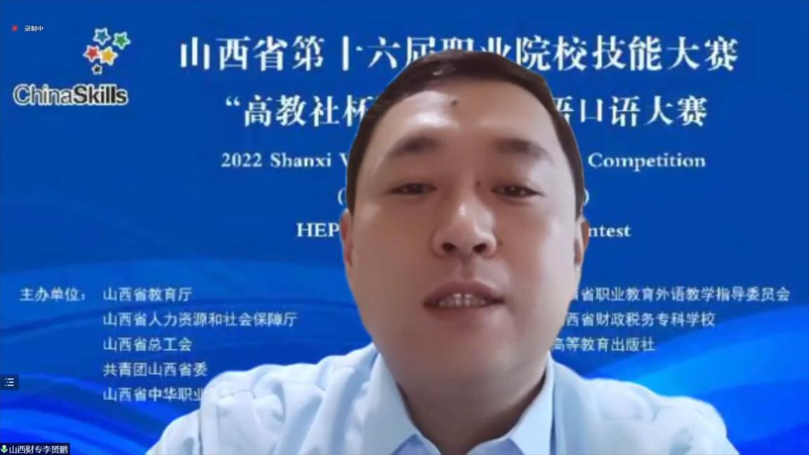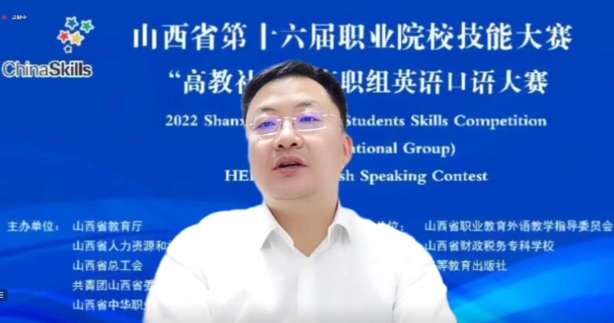 开幕式上李赟鹏校长首先致欢迎辞,他向莅临赛场的各位领导、评委及选手介绍了学校的发展概况,并预祝本次大赛圆满成功;高等教育出版社外语事业部张慧勇副主任和山西大学郑仰成教授就“高教社杯”高职组英语口语大赛的现状和未来发展规划进行了发言;山西省教育厅职业教育与成人教育处韩瑞勇处长在致辞中指出:2022年山西省第十六届职业院校技能大赛的举办,是我省学习和贯彻党的二十大精神和全国、全省职教大会精神以及推动我省职业教育高质量发展的一项重要实践活动,希望bat365正版唯一官网在山西省职业教育外语教学指导委员会的专业指导下,继续引领我省高职院校外语教学改革,强化高职院校学生用英语讲中国故事的能力,提高学生职场交际的综合能力、思辨能力,探索职业院校外语教师专业发展的新模式,寻找职业教育改革和产教融合的新路径。同时,他也希望承办校能创新线上比赛、线上评判、线上监督的办赛模式,固定系列制度规程,保证线上比赛与线下比赛等质同效,最后,韩瑞勇处长预祝各位选手取得优异的成绩,并宣布山西省第十六届职业院校技能大赛“高教社杯”高职组英语口语大赛正式开赛。