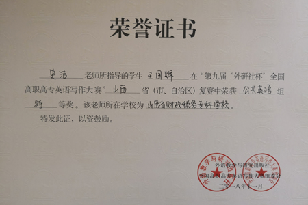 10月28日,第九届“外研社杯”全国高职高专英语写作大赛山西省复赛在太原学院举行,由外语教学部史洁老师指导的2016级移动应用开发班学生王国辉在比赛中脱颖而出,喜获山西赛区公共英语组特等奖。
