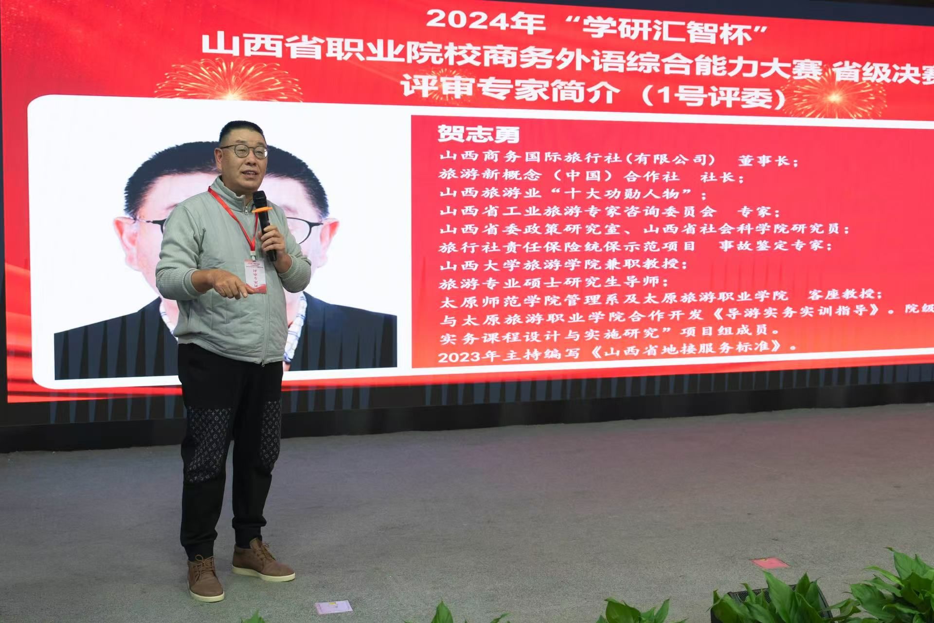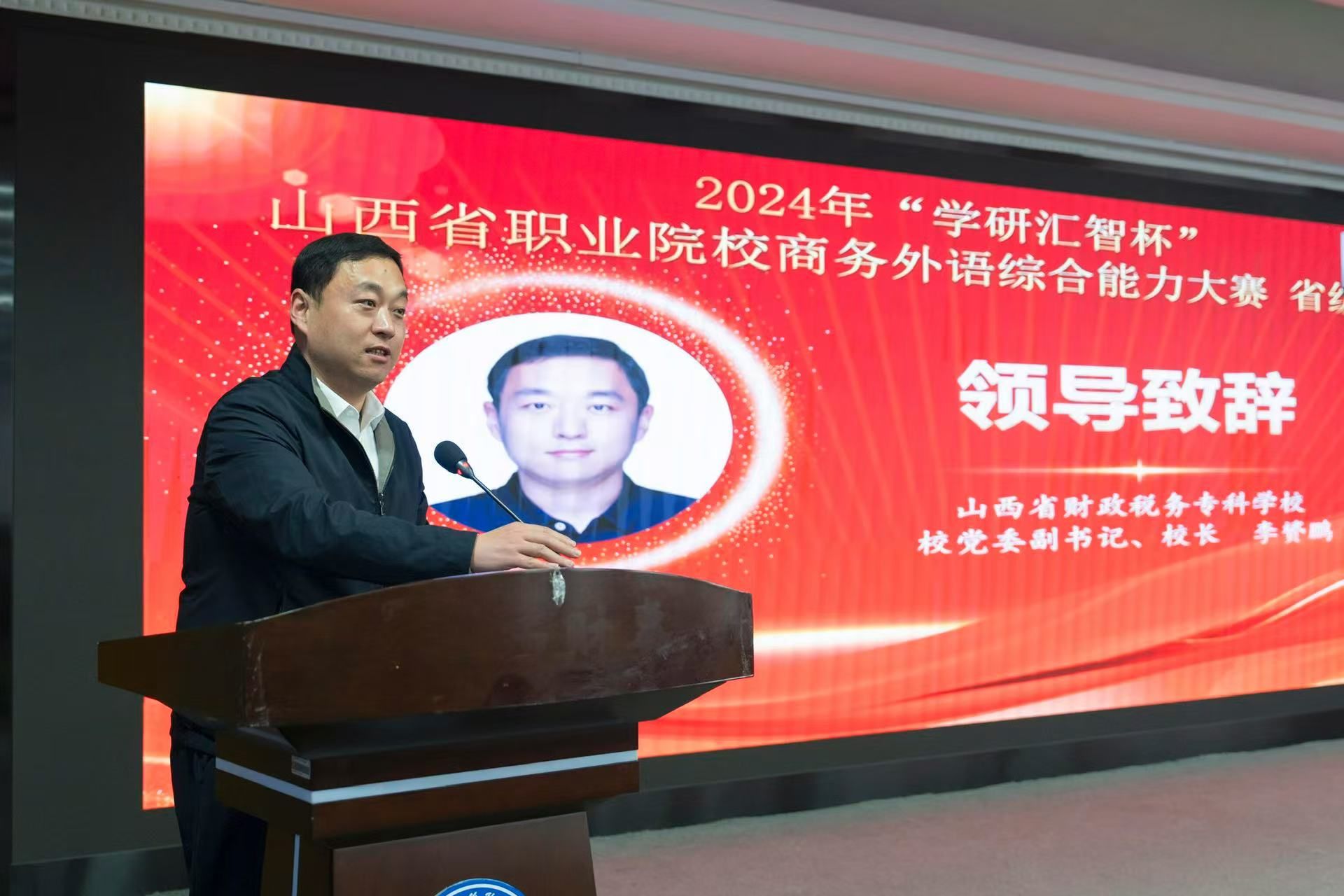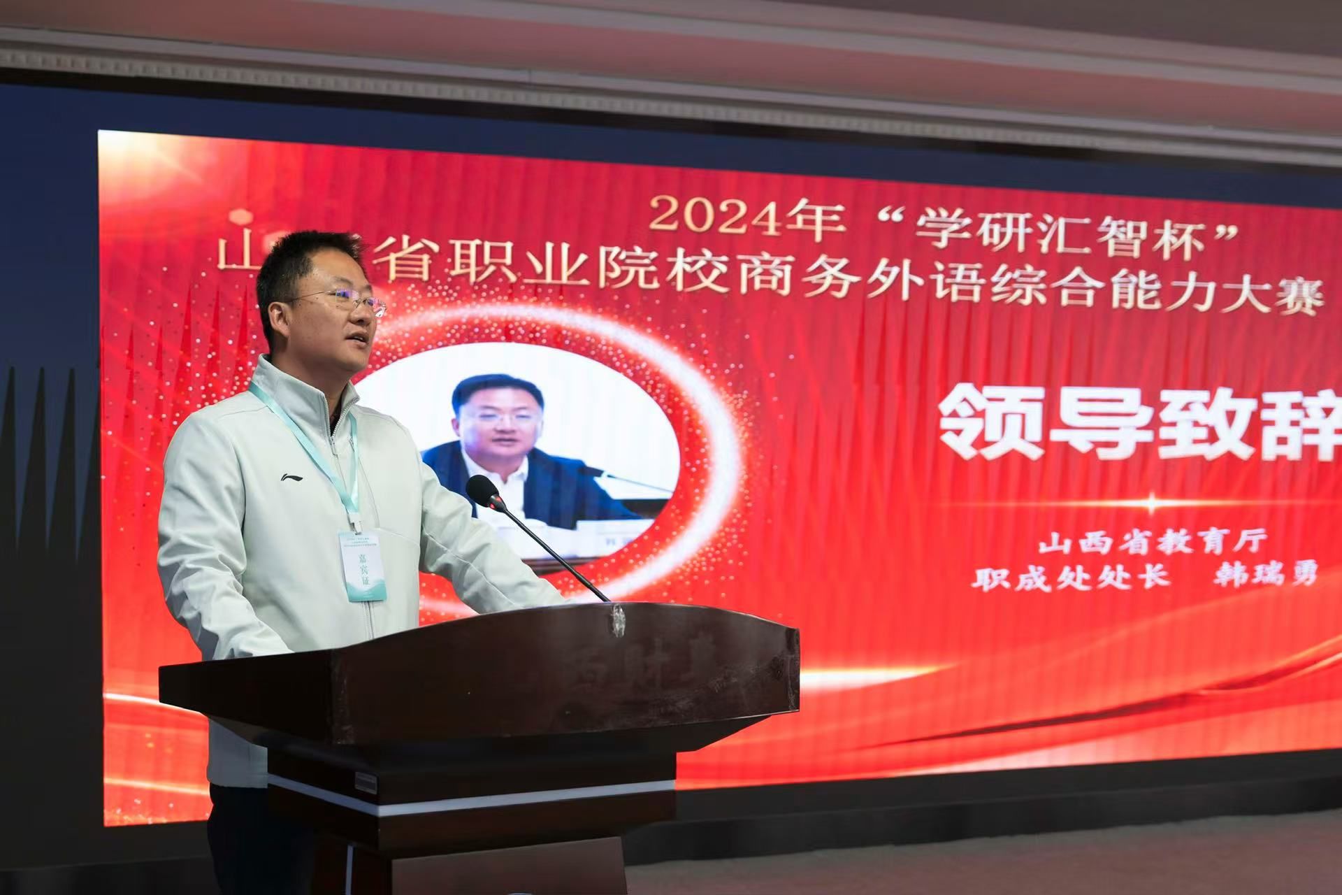 在全球数字经济蓬勃发展的大背景下,为推动商务外语教育高质量发展,主动服务国家开放战略,由山西省职业教育外语教学指导委员会和中国国际贸易学会联合多方共同举办的2024年“学研汇智杯”山西省职业院校商务外语综合能力大赛备受瞩目。该项赛事省级决赛已于10月26日在bat365正版唯一官网圆满落下帷幕。山西省教育厅职成处处长韩瑞勇、校党委书记秦华伟、校党委副书记校长李赟鹏、校党委委员副校长冯东元、北京学研汇智网络科技有限公司总经理陈丽莉女士亲临现场为选手助威。
