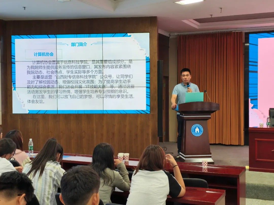 信息科技学院学生科科长,分团委书记李博老师为新生们揭开了学生组织的神秘面纱。李老师详细介绍了学院组织的职能、特色及活动开展情况,鼓励新生们勇敢尝试、积极参与,利用学生组织这一平台锻炼自己、展示自己、成就自己。同时,也提醒新生们要平衡好学习与活动的关系,做到全面发展、健康成长。