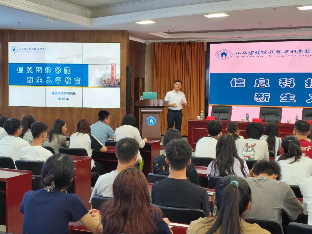 信息科技学院院长朱壮华老师为新生们描绘了一幅信息科技领域的宏伟蓝图。朱老师通过生动的案例和详实的数据,深入浅出地介绍了学院的专业设置、师资力量及科研成果,让新生们对即将踏入的学术殿堂有了更加清晰的认识。