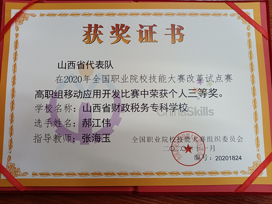 2020年11月7日-10日,全国职业院校技能大赛改革试点赛高职组移动应用开发赛项在山东科技职业学院举行,来自全国各省、市、自治区和新疆生产建设兵团的30支代表队共30名选手同台竞技。bat365信息学院张海玉老师指导的2018级移动应用开发专业学生郝江伟在比赛中荣获三等奖。