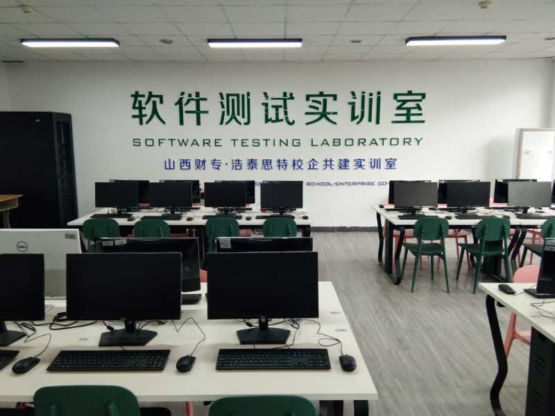 软件测试综合实训室于2019年10月建成并投入使用。实训室中有桌面云服务器、软件测试实训服务器、多媒体教学设备、云桌面终端等设备,还有在线教育测试实践平台、基于 MIS 业务的被测管理系统等软件,以及功能测试、自动化测试、性能测试等方面的课程资源,可以满足测试类课程及其他相关课程的实验实训需求。