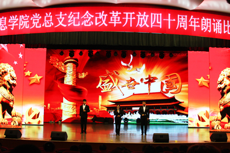 学生诗歌朗诵比赛主题鲜明,选手朗诵语言流畅、语调铿锵有力、节奏协调,韵味十足,各位参赛同学以饱满的热情、激昂的语调讴歌了改革开放四十周年来我国取得的重大发展。赛场上选手们自然大方的举止,充分体现了我院学生朝气蓬勃、昂扬奋进的精神面貌。本次比赛,旨在通过朗诵演绎的方式,热情讴歌改革开放以来全国各族人民在党的领导下,在经济建设、政治建设、文化建设、社会建设、生态文明建设以及全面建成小康社会、全面深化改革、全面推进依法治国、全面从严治党中取得的伟大成就,弘扬正能量,营造积极向上的校园文化氛围,展现当代大学生热爱祖国,积极向上的精神风貌。