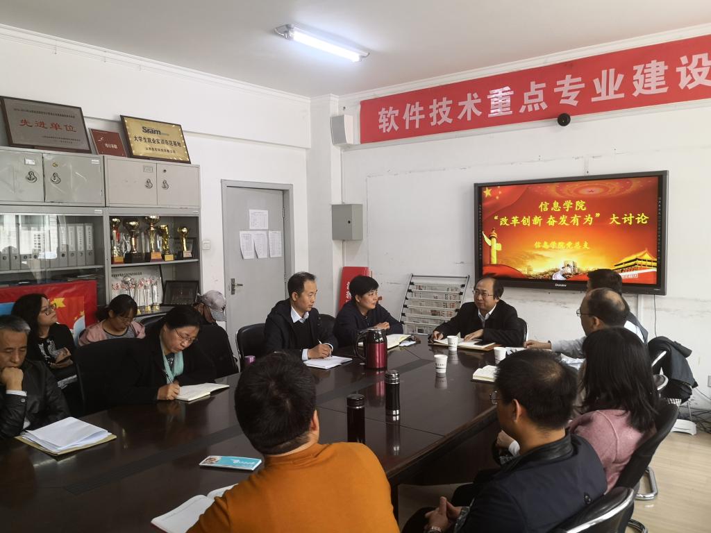 2019年3月19日信息学院党总支开展“改革创新,奋发有为”大讨论,校党委委员、纪委书记张俊平莅临指导。