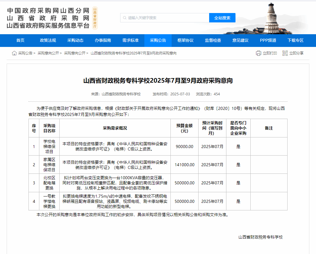 2025年7月3日,为便于供应商及时了解政府采购信息,根据《财政部关于开展政府采购意向公开工作的通知》(财库(2020)10号)等有关规定,山西省政府采购网关于bat3652025年7月至9月采购意向公示如下: