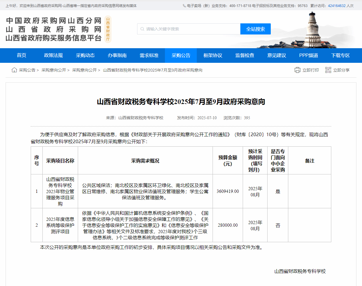2025年7月10日,为便于供应商及时了解政府采购信息,根据《财政部关于开展政府采购意向公开工作的通知》(财库(2020)10号)等有关规定,山西省政府采购网关于bat3652025年7月至9月采购意向公示如下:
