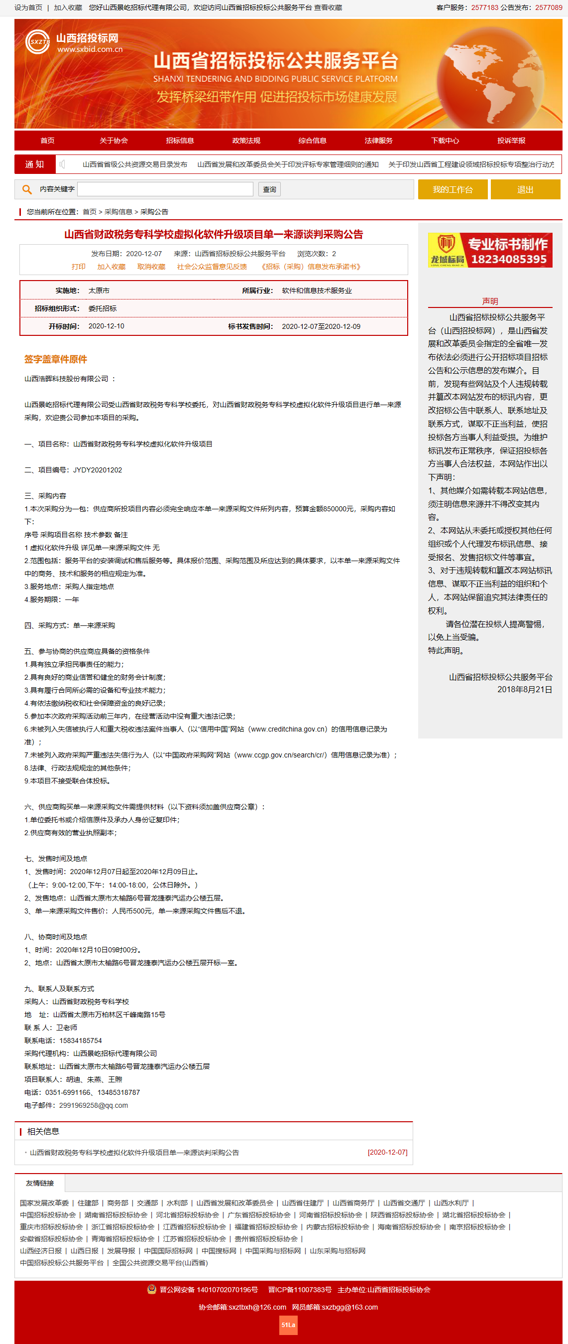 2020年12月7日,山西景屹招标代理有限公司受bat365委托,对bat365“虚拟化软件升级”项目发布了单一来源采购公告,山西省招投标网关于本项目采购公告如下: