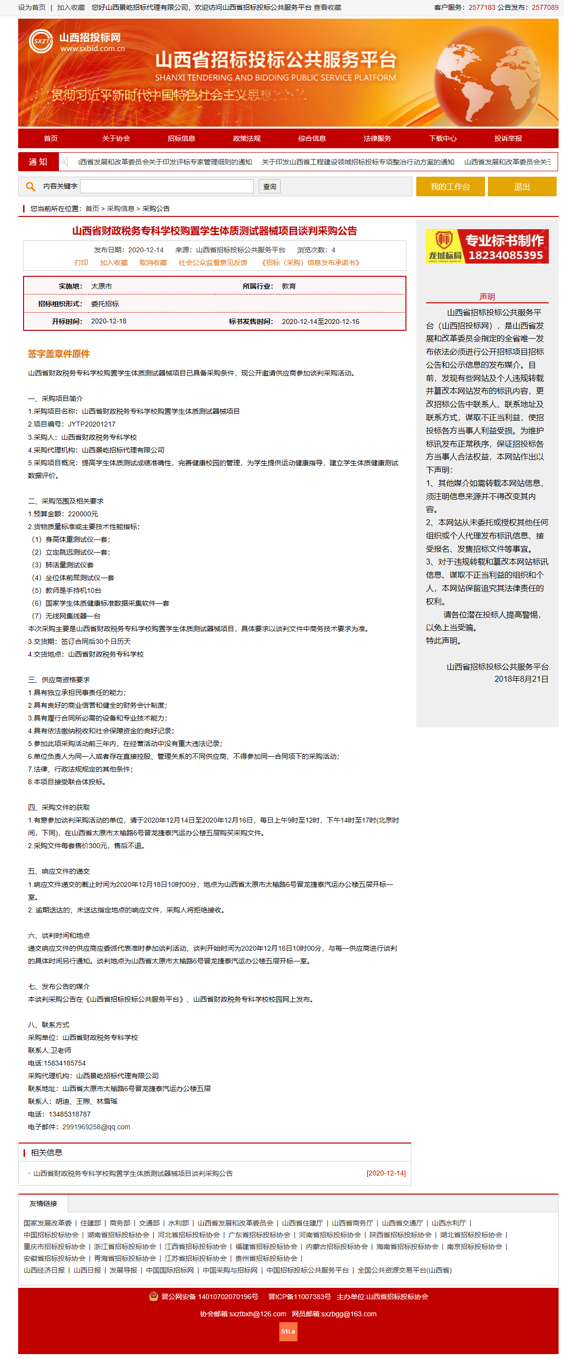 2020年12月14日,山西景屹招标代理有限公司受bat365委托,对bat365“购置学生体质测试器械”项目发布了谈判公告,山西省招投标网关于本项目采购公告如下: