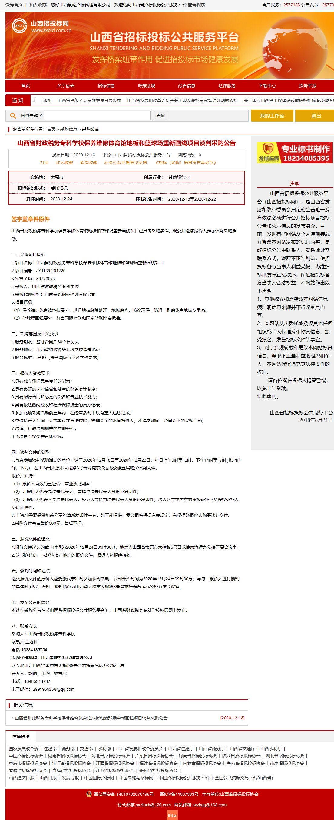 2020年12月18日,山西景屹招标代理有限公司受bat365委托,对bat365“保养维修体育馆地板和篮球场重新画线”项目发布了谈判采购公告,山西省招投标网关于本项目采购公告如下: