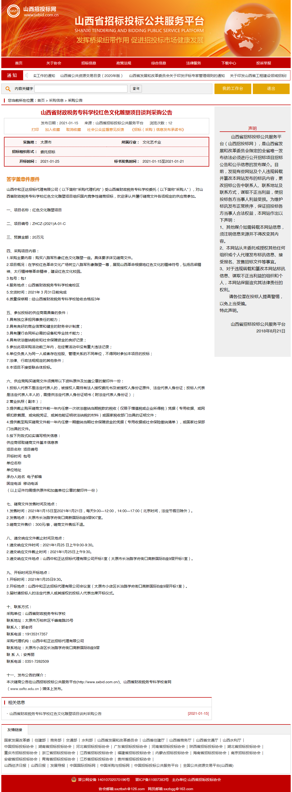 2021年1月15日,山西中和正达招标代理有限公司受bat365委托,对bat365正版唯一官网红色文化雕塑项目组织了国内竞争性磋商招标,山西省招投标网关于本项目采购公告如下: