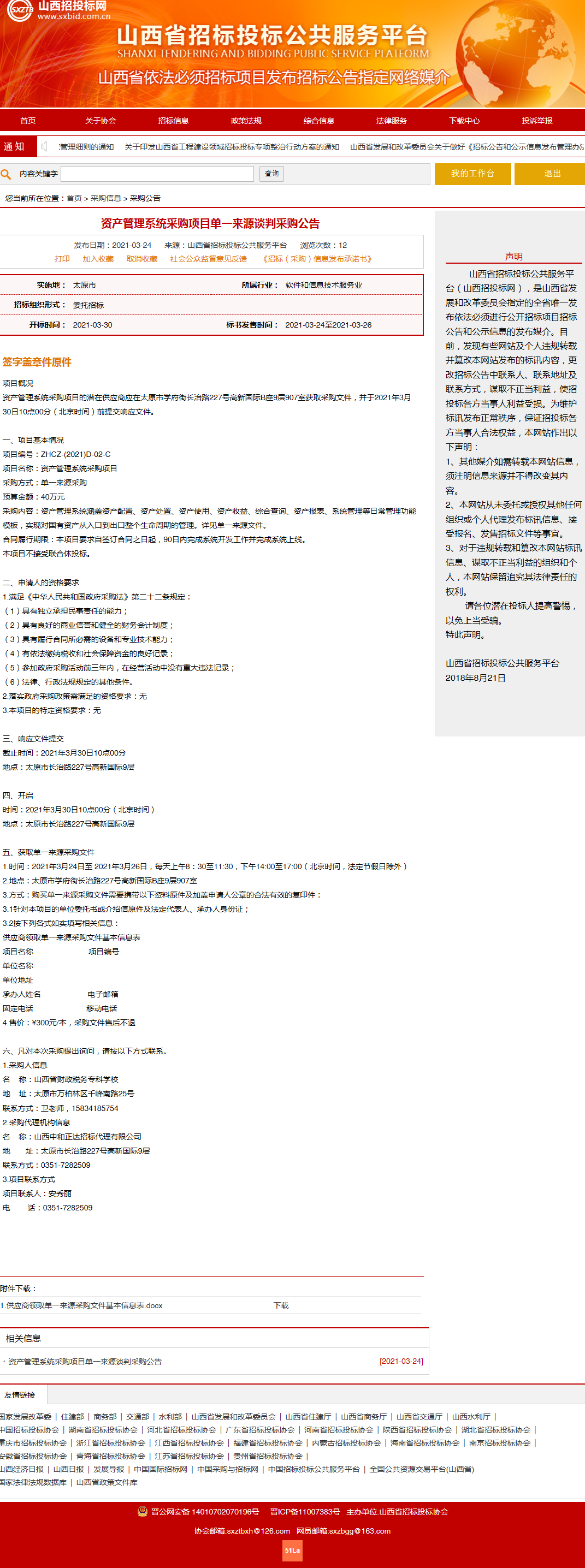 2021年3月24日,山西中和正达招标代理有限公司受bat365委托,对bat365资产管理系统项目发布了单一来源谈判采购公告,山西省招投标网关于本项目采购公告如下: