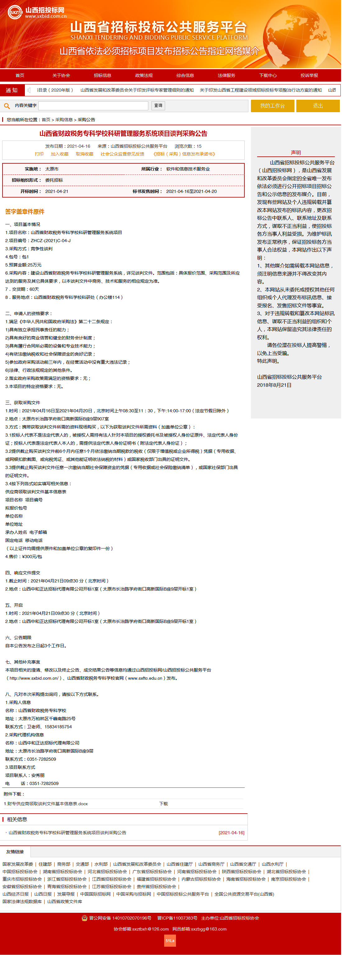 2021年4月16日,山西中和正达招标代理有限公司受bat365委托,对bat365“科研管理服务系统”项目发布了谈判采购公告,山西省招投标网关于本项目采购公告如下: