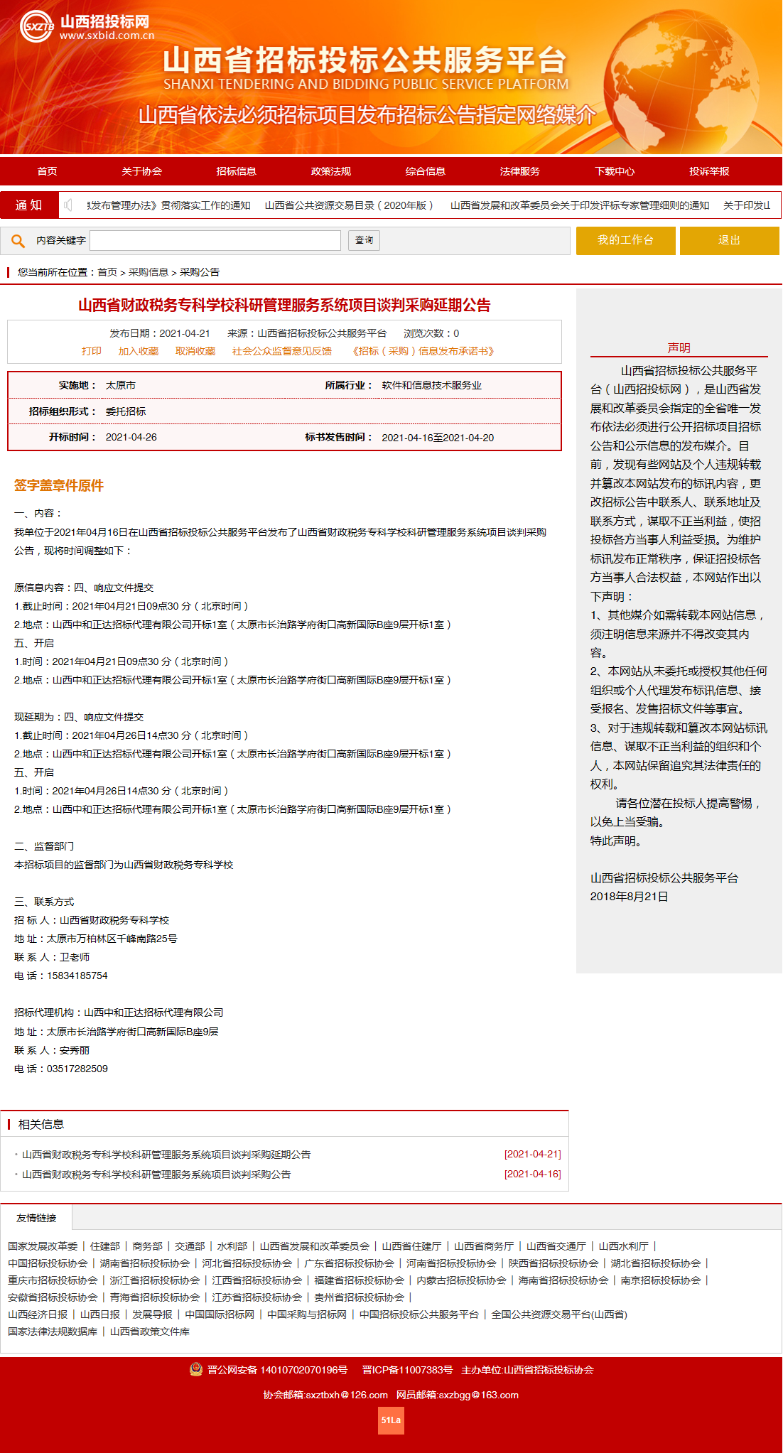 2021年4月21日,山西中和正达招标代理有限公司受bat365委托,对bat365“科研管理服务系统”项目发布了谈判采购延期公告,山西省招投标网关于本项目延期公告如下: