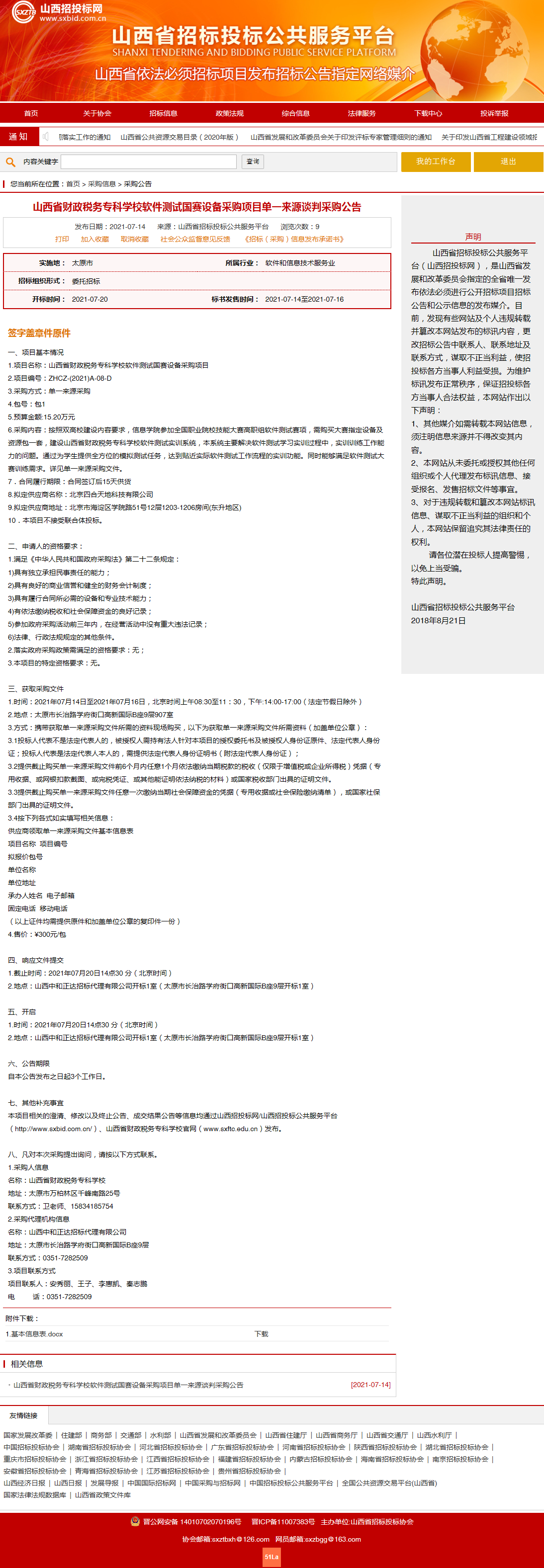 2021年7月14日,山西中和正达招标代理有限公司受bat365委托,对bat365软件测试国赛设备采购项目发布了单一来源谈判采购公告,山西省招投标网关于本项目采购公告如下:
