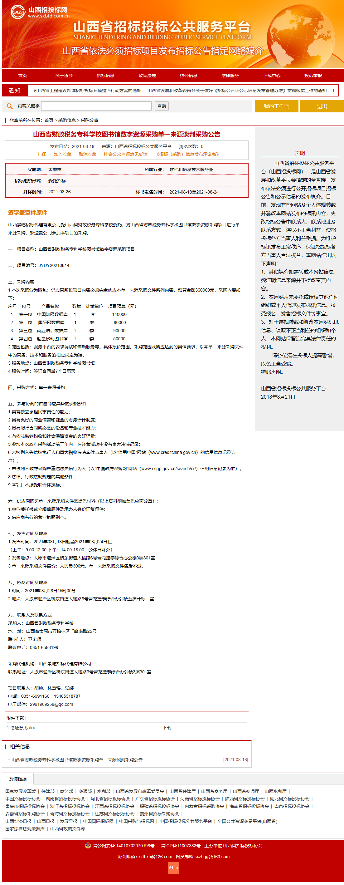 2021年8月18日,山西景屹招标代理有限公司受bat365委托,对bat365图书馆数字资源项目发布了单一来源谈判采购公告,山西省招投标网关于本项目采购公告如下: