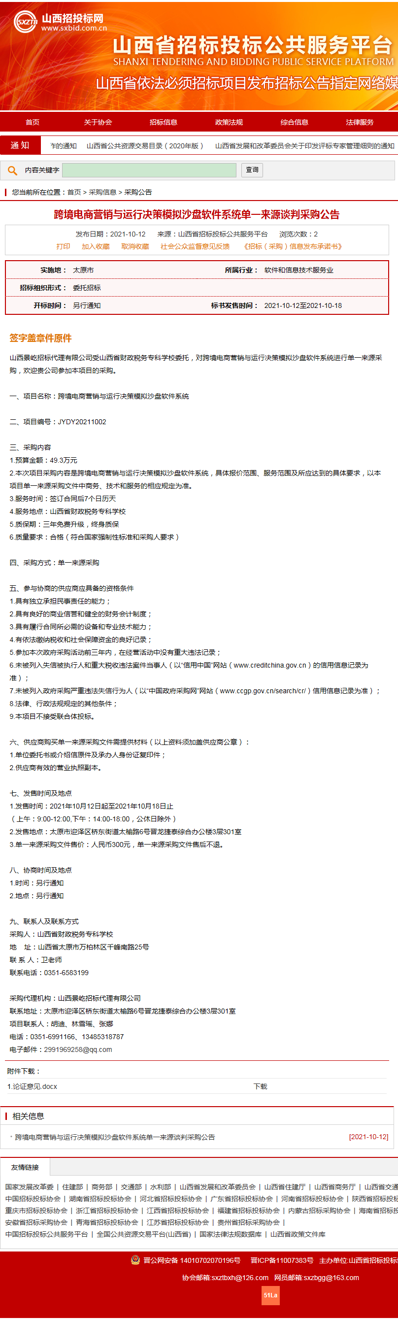 2021年10月12日,山西景屹招标代理有限公司受bat365委托,对bat365“跨境电商营销与运行决策模拟沙盘软件系统”项目发布了单一来源谈判采购公告,山西省招投标网关于本项目采购公告如下:
