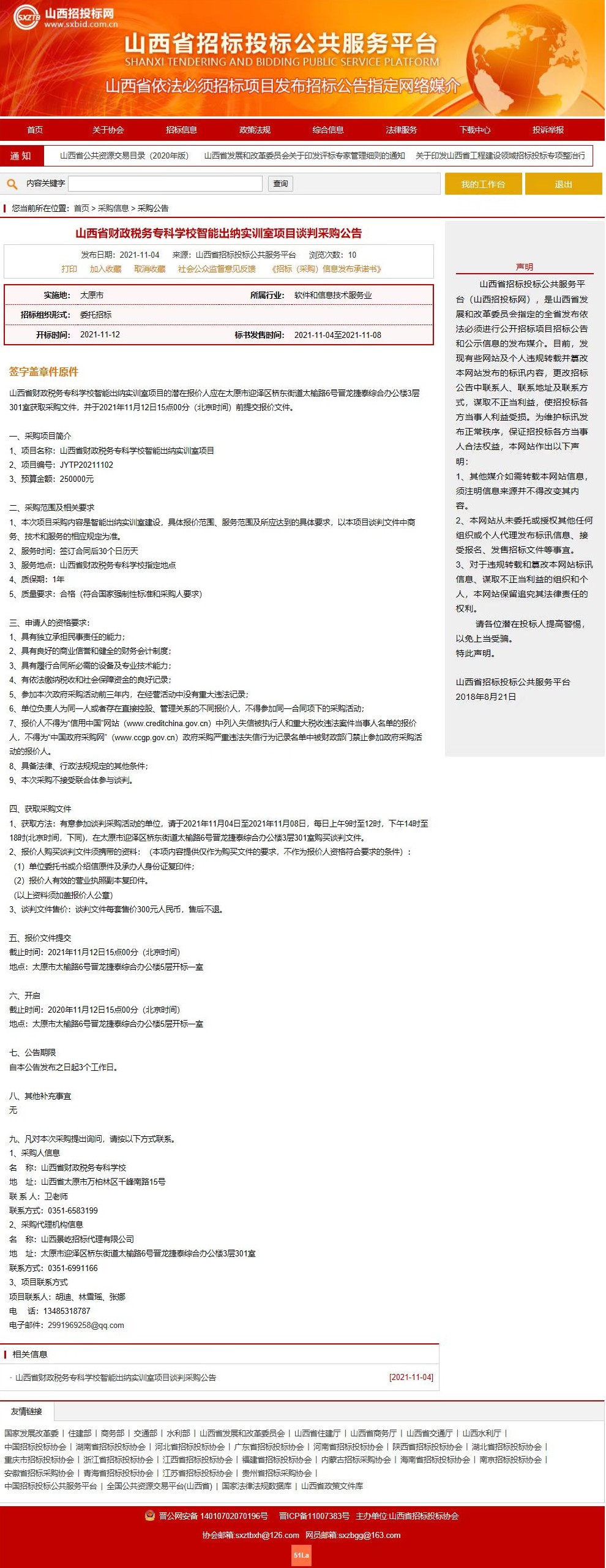 2021年11月4日,山西景屹招标代理有限公司受bat365委托,对bat365“智能出纳实训室”项目发布了谈判采购公告,山西省招投标网关于本项目采购公告如下:
