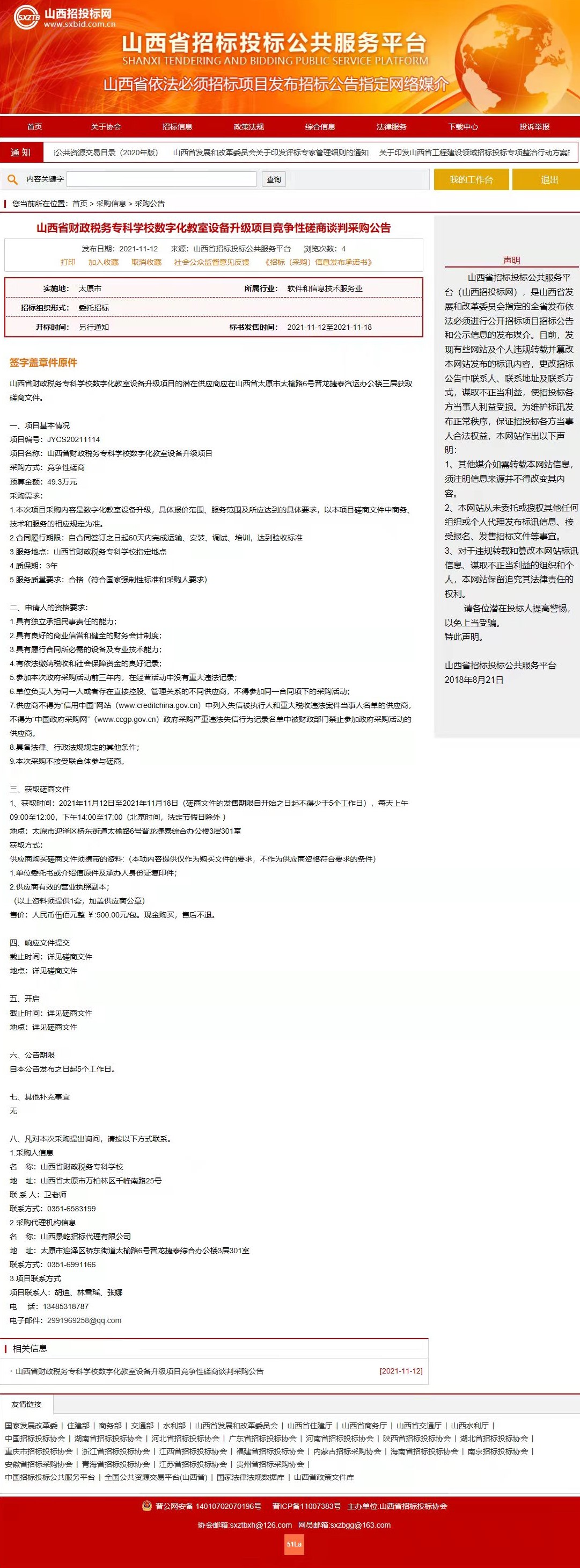 2021年11月12日,山西景屹招标代理有限公司受bat365委托,对bat365“数字化教室设备升级”项目发布了竞争性磋商公告,山西省招投标网关于本项目采购公告如下:
