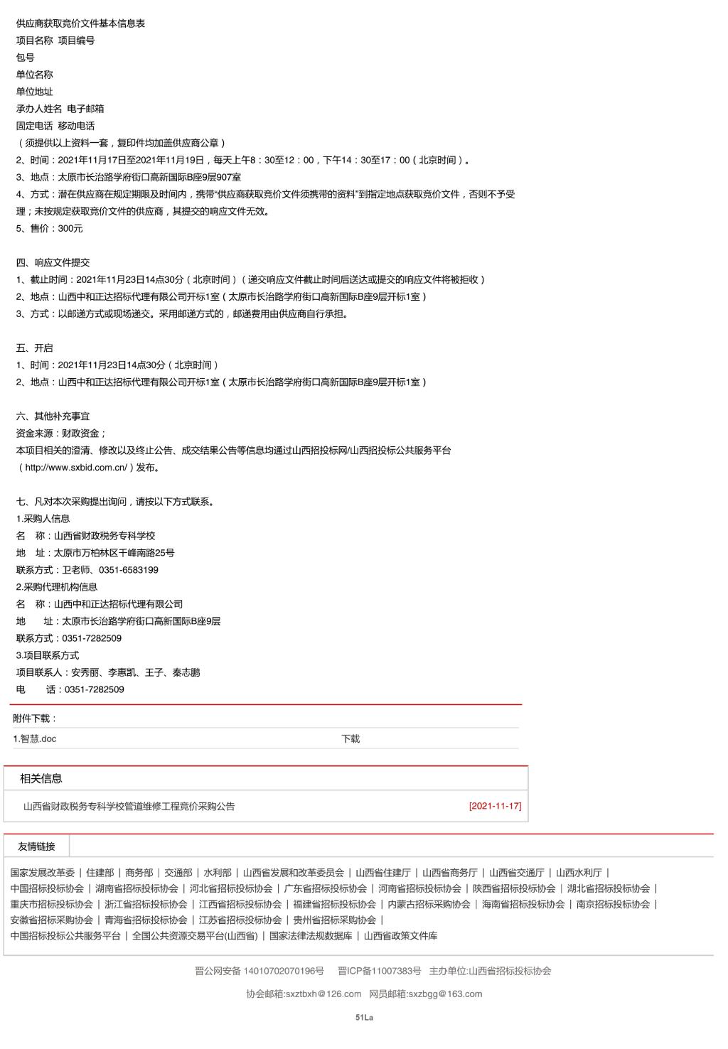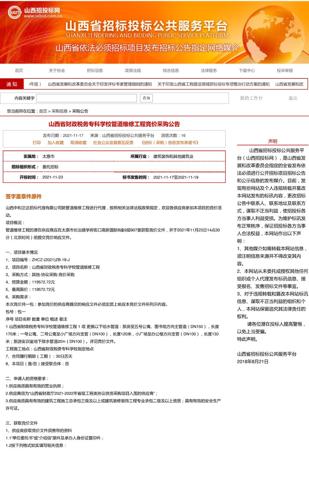 2021年11月17日,山西中和正达招标代理有限公司受bat365委托,对bat365“管道维修”工程发布了竞价采购公告,山西省招投标网关于本项目采购公告如下: