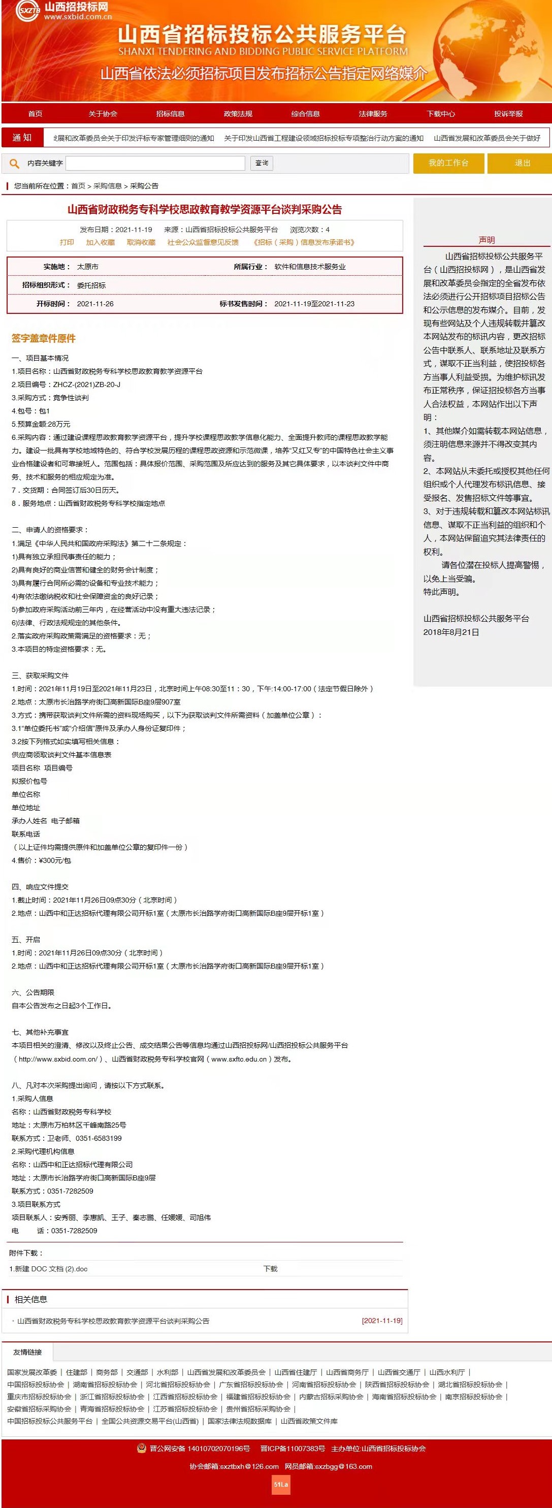 2021年11月19日,山西中和正达招标代理有限公司受bat365委托,对bat365“思政教育教学资源平台”项目发布了竞争性谈判采购公告,山西省招投标网关于本项目采购公告如下: