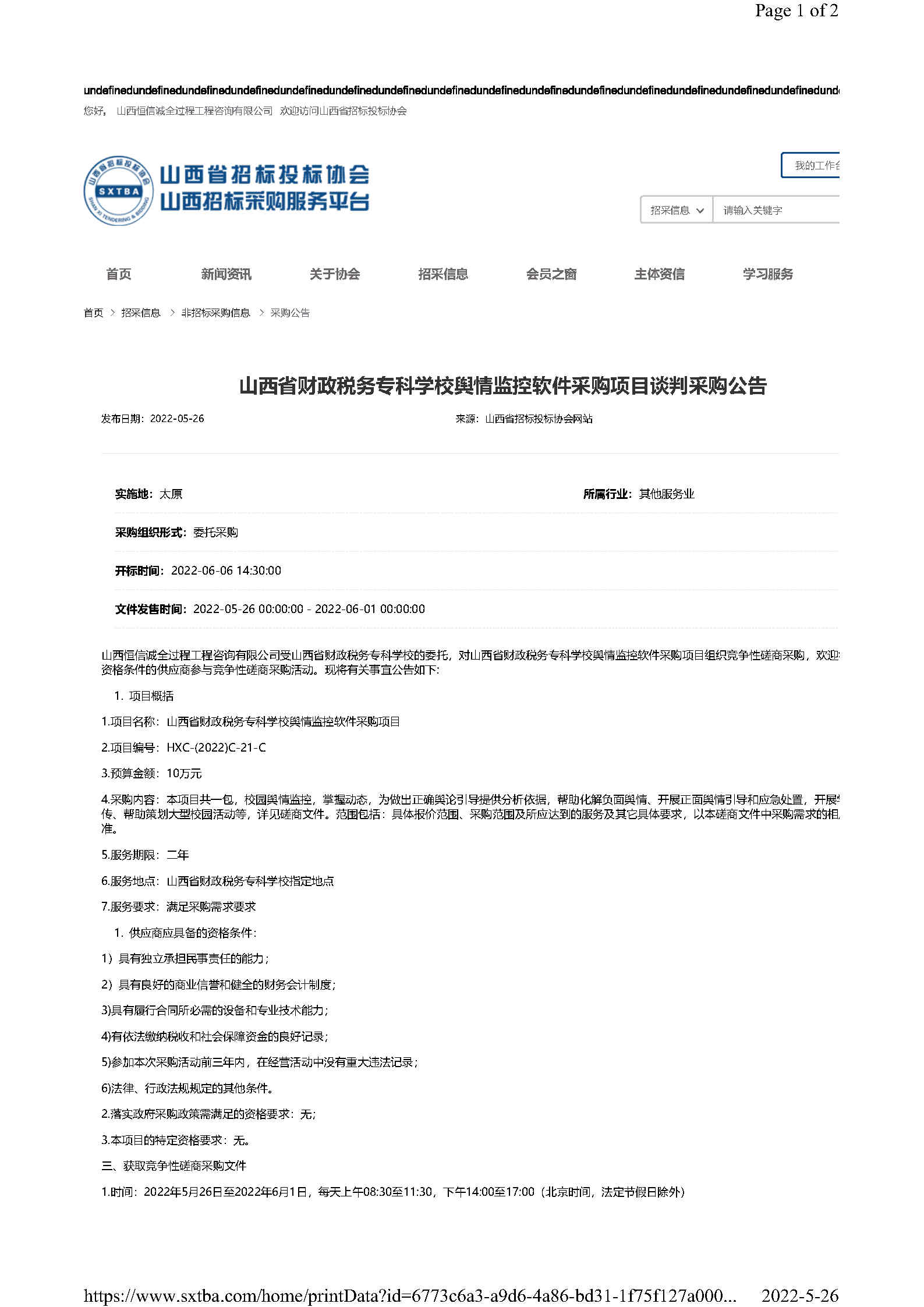 2022年5月26日,山西恒信诚全过程有限公司受bat365委托,对bat365“舆情监控软件采购”项目发布了竞争性磋商采购公告,山西省招投标网关于本项目采购公告如下: