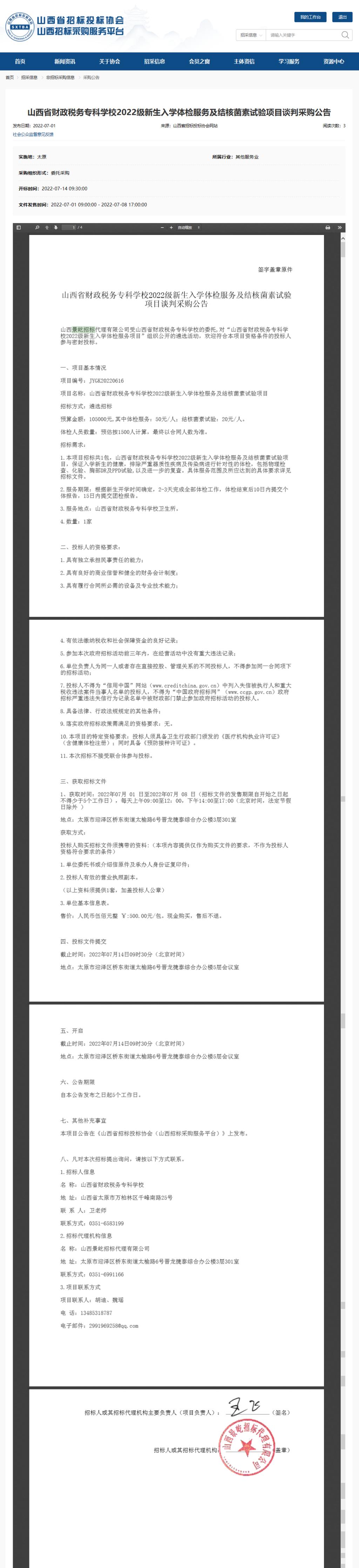 2022年7月1日,山西景屹招标代理有限公司受bat365委托,对bat365“2022级新生入学体检服务及结核菌素试验”项目发布了遴选招标采购公告,山西省招投标网关于本项目采购公告如下: