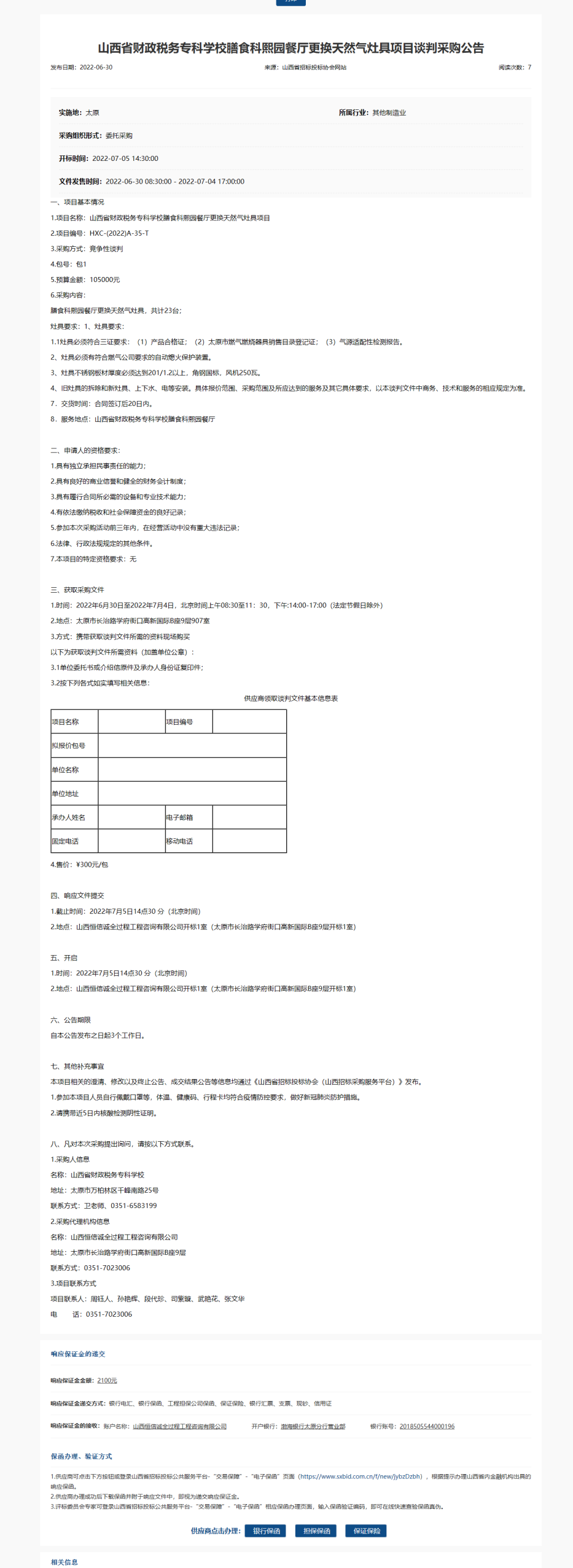 2022年6月30日,山西恒信诚全过程工程有限公司受bat365委托,对bat365“膳食科熙园餐厅更换天然气灶具”项目发布了竞争性谈判采购公告,山西省招投标网关于本项目采购公告如下: