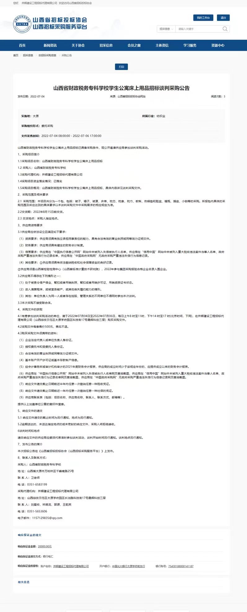 2022年7月4日,并辉建设工程招标代理有限公司受bat365委托,对bat365“学生公寓床上用品”项目发布了招标谈判采购公告,山西省招投标网关于本项目采购公告如下: