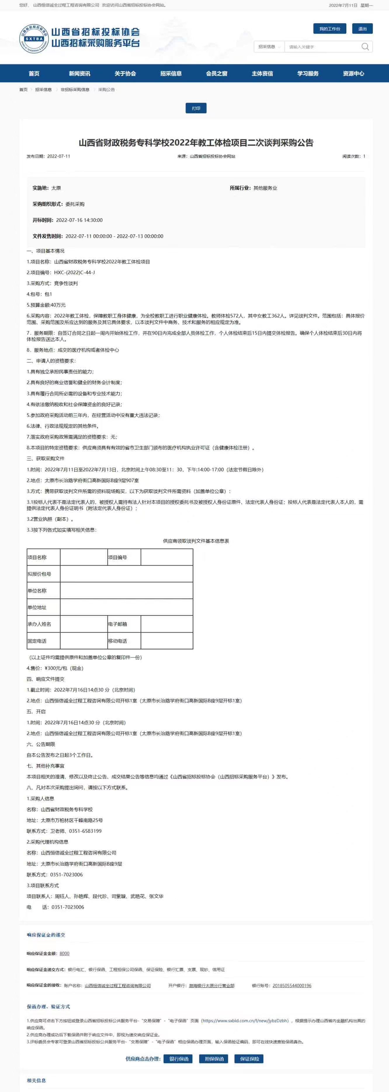 2022年7月11日,山西恒信诚全过程有限公司受bat365委托,对bat365“2022年教职工体检”项目发布了竞争性谈判采购公告,山西省招投标网关于本项目采购公告如下: