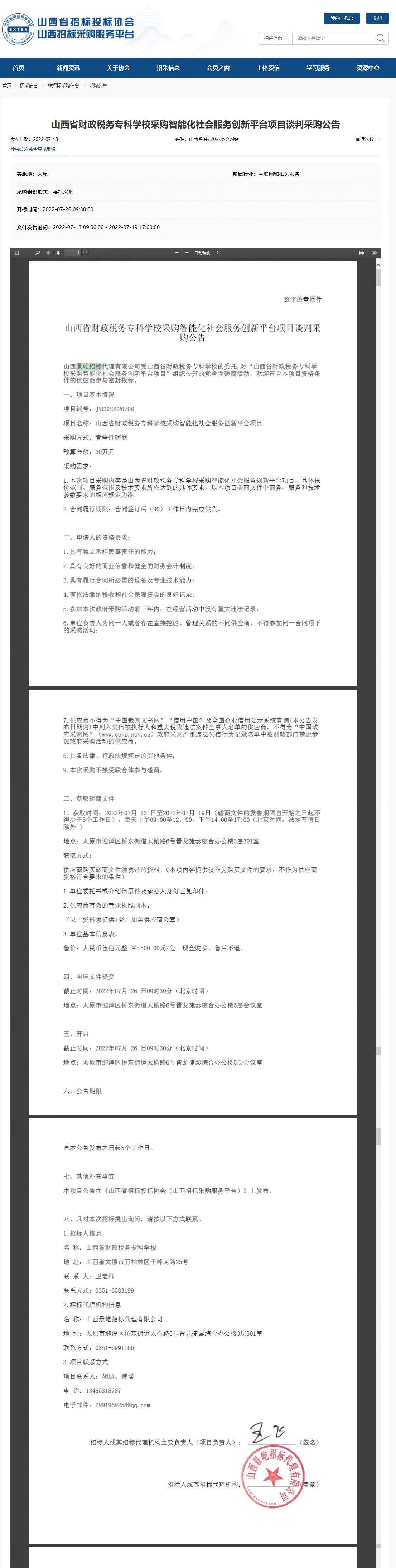 2022年7月13日,山西景屹招标有限公司受bat365委托,对bat365“智能化社会服务创新平台”项目发布了竞争性磋商采购公告,山西省招投标网关于本项目采购公告如下: