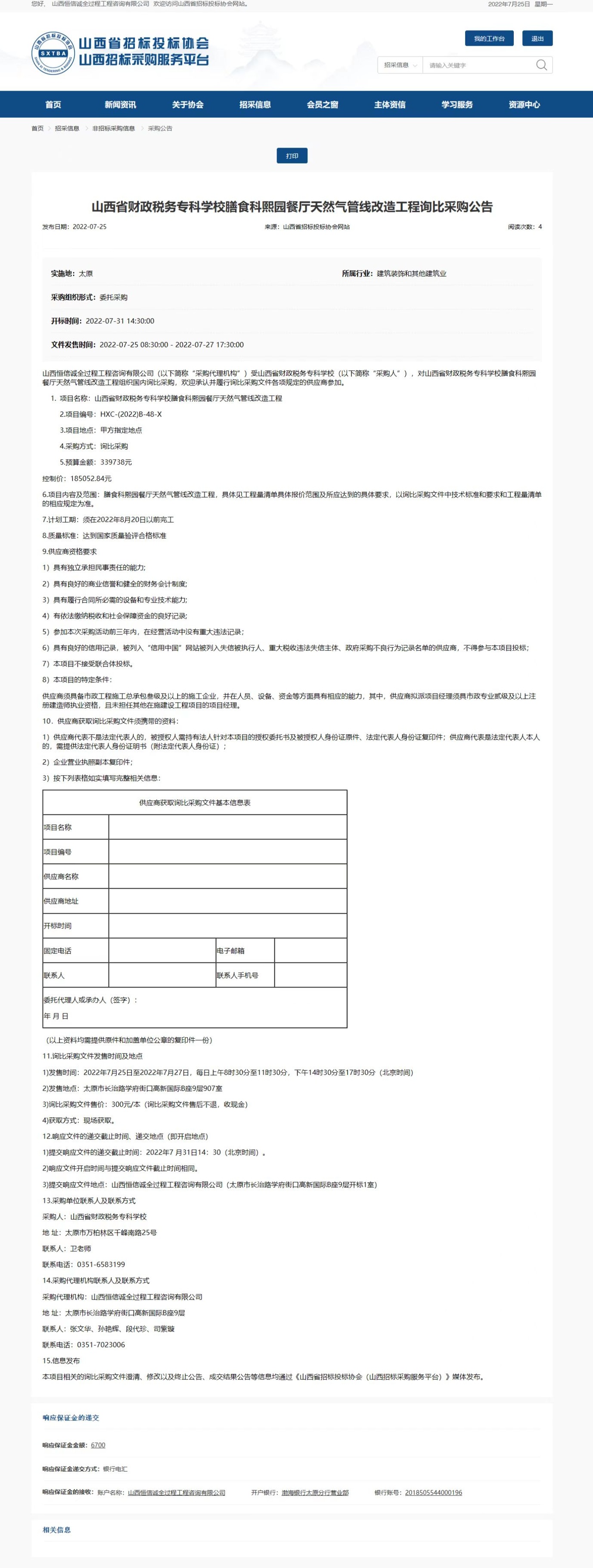 2022年7月25日,山西恒信诚全过程工程咨询有限公司受bat365委托,对bat365“膳食科熙园餐厅天然气管线改造”项目发布了询比采购公告,山西省招投标网关于本项目公告如下: