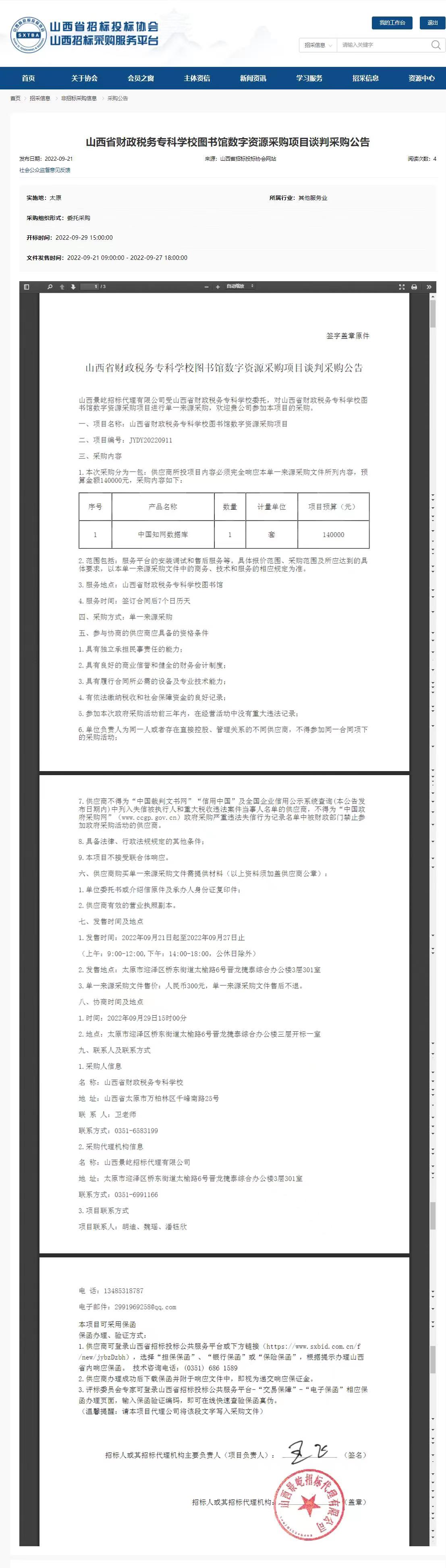 2022年9月21日,山西景屹招标代理有限公司受bat365委托,对bat365“图书馆数字资源”项目发布了谈判采购公告,山西省招投标网关于本项目公告如下: