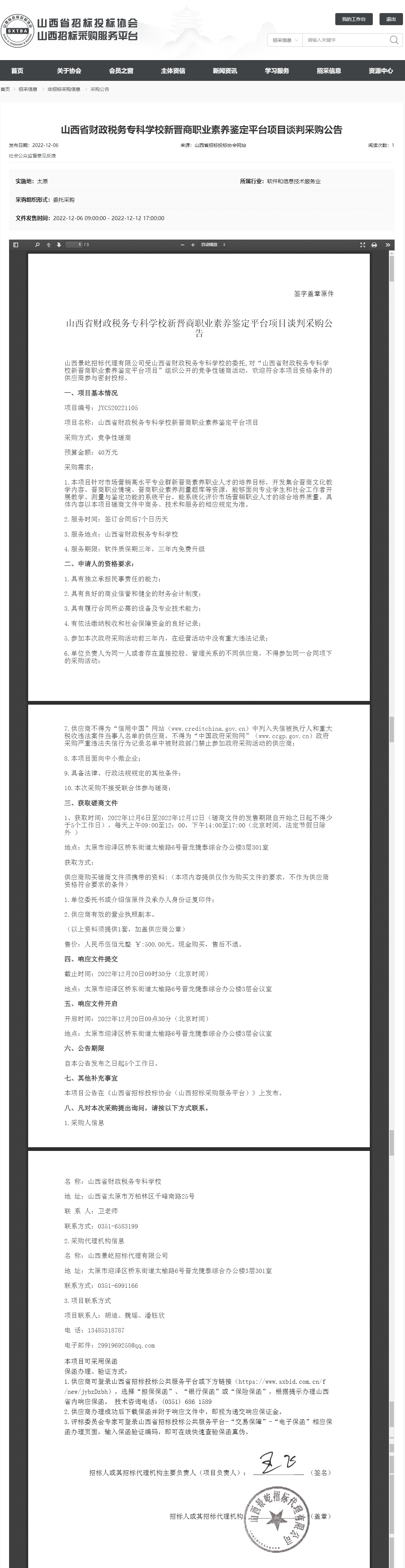 2022年12月06日,山西景屹招标代理有限公司受bat365委托,对bat365“新晋商职业素养鉴定平台”项目发布了竞争性磋商采购公告,山西省招投标网关于本项目的公告如下: