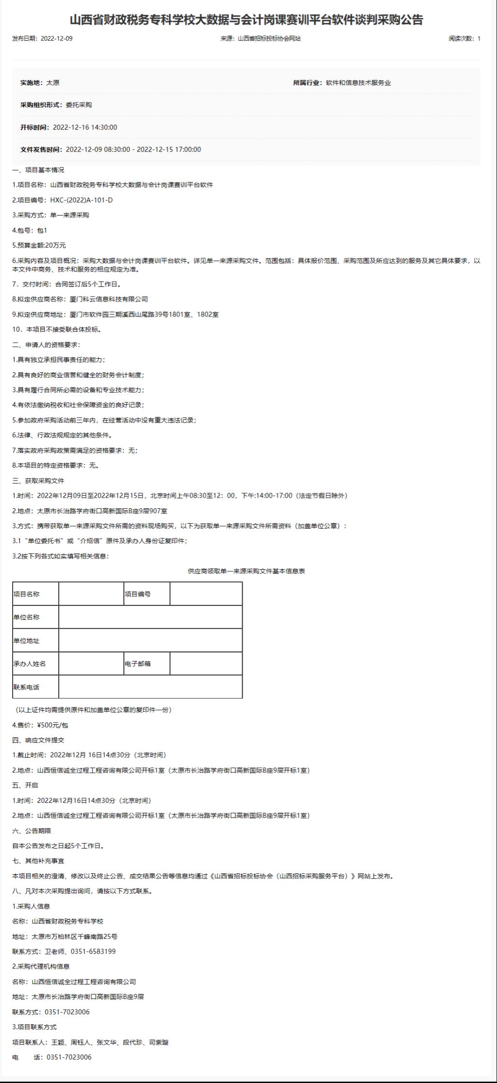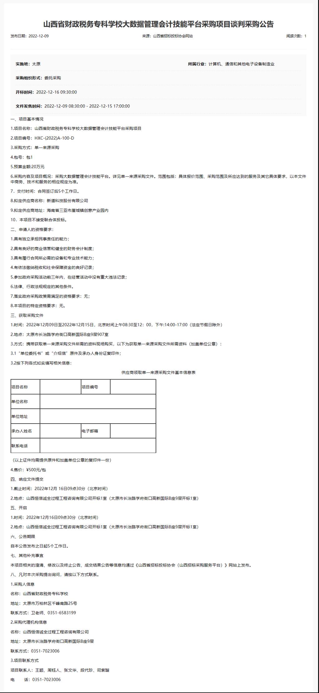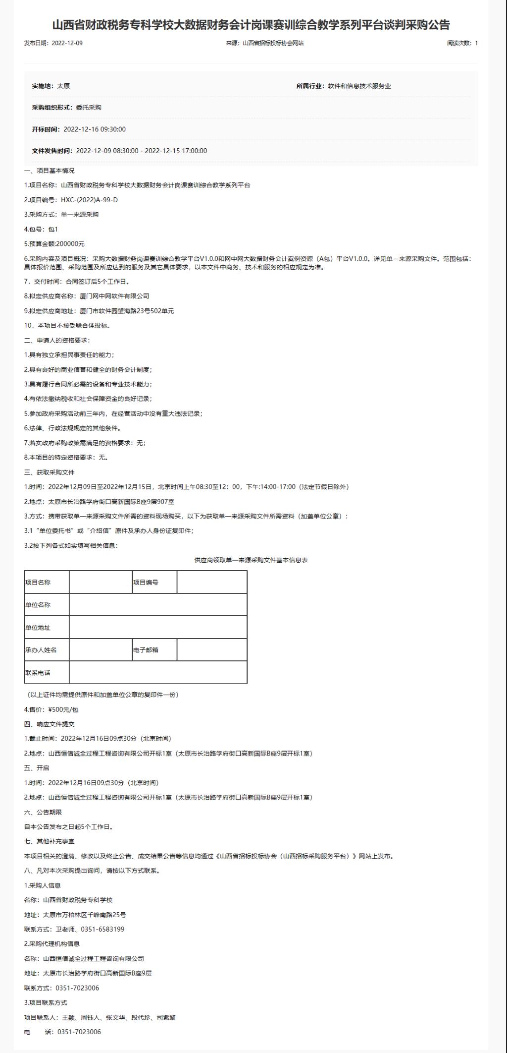2022年12月09日,山西恒信诚全过程工程咨询有限公司受bat365委托,对bat365“大数据财务会计岗课赛训综合教学系列平台”项目发布了单一来源采购公告,山西省招投标网关于本项目的公告如下: