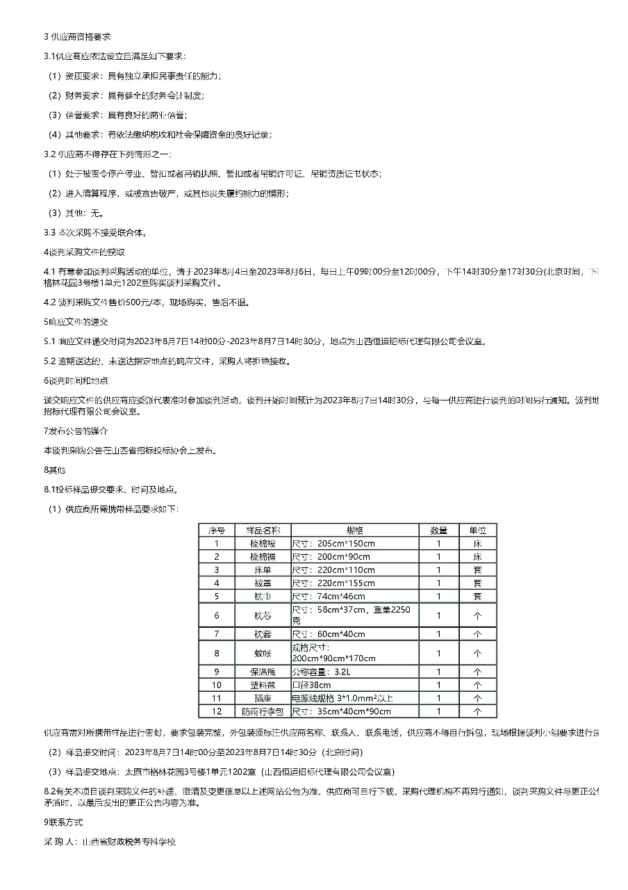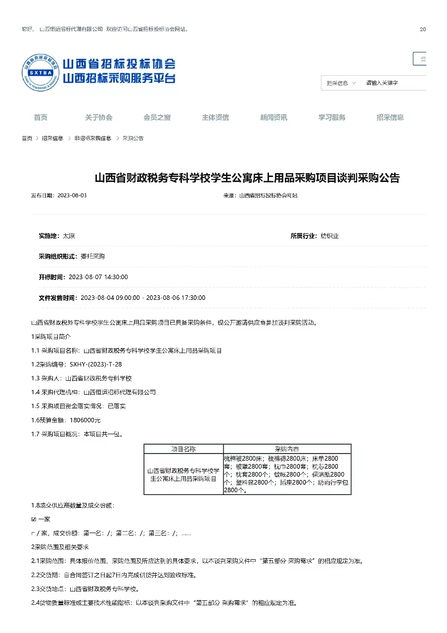 2023年08月03日,山西恒运招标代理有限公司受bat365委托,对bat365“学生公寓床上用品”项目发布了谈判采购公告,山西省招投标网关于本项目的公告如下:
