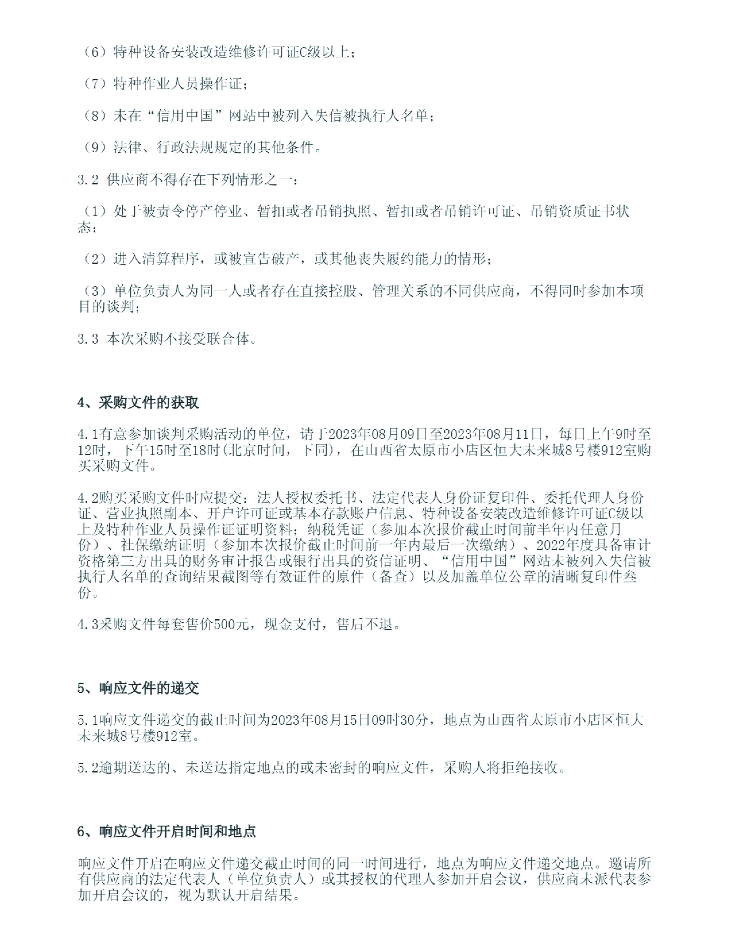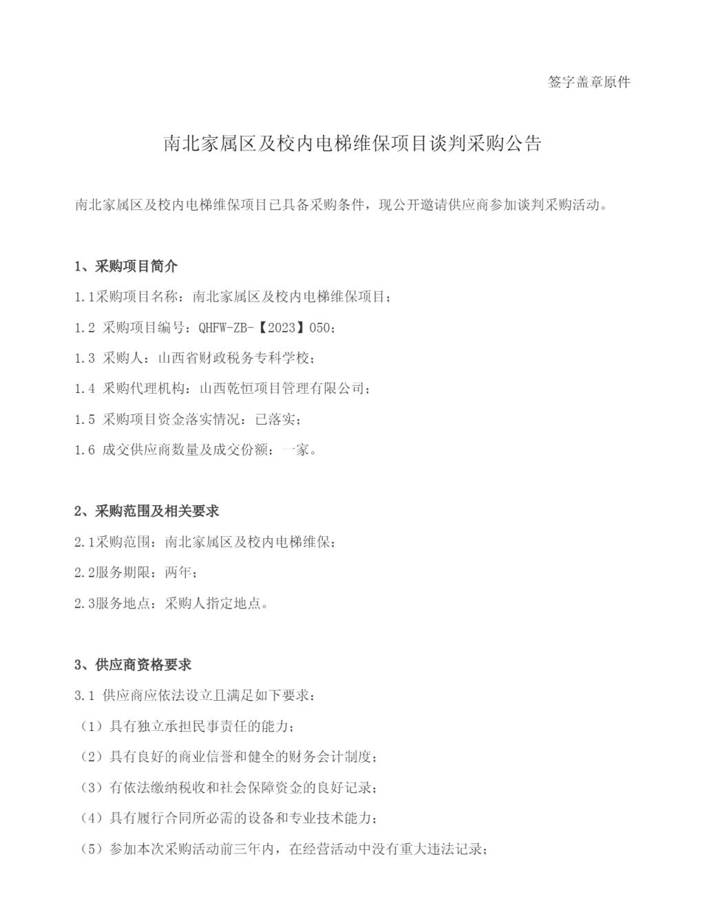 2023年8月9日,山西乾恒项目管理有限公司受bat365委托,对bat365“南北家属区及校内电梯维保”项目发布了谈判采购公告,山西省招投标网关于本项目的公告如下: