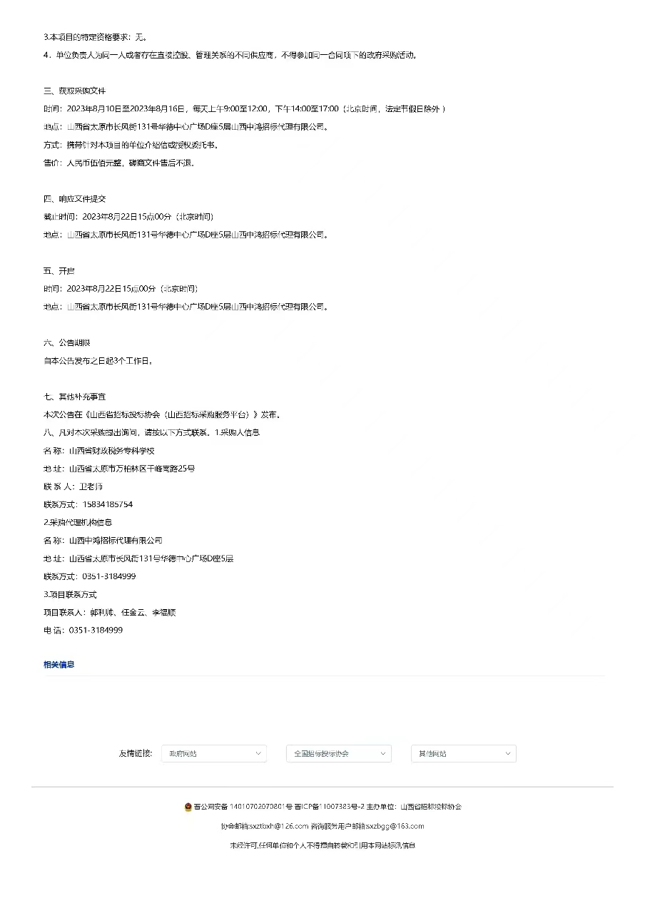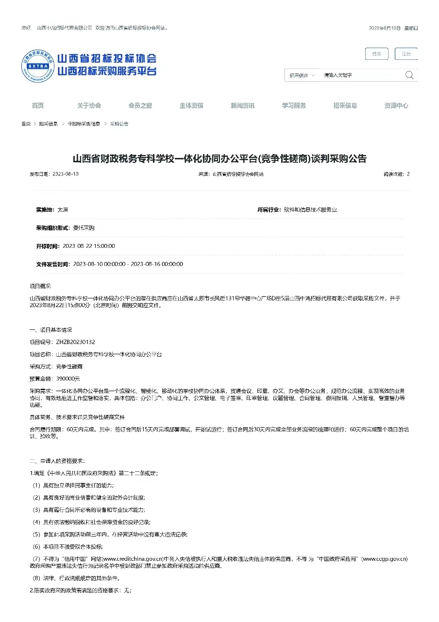2023年8月10日,山西中鸿招标代理有限公司受bat365委托,对bat365“一体化协同办公平台”项目发布了竞争性磋商采购公告,山西省招投标网关于本项目的公告如下: