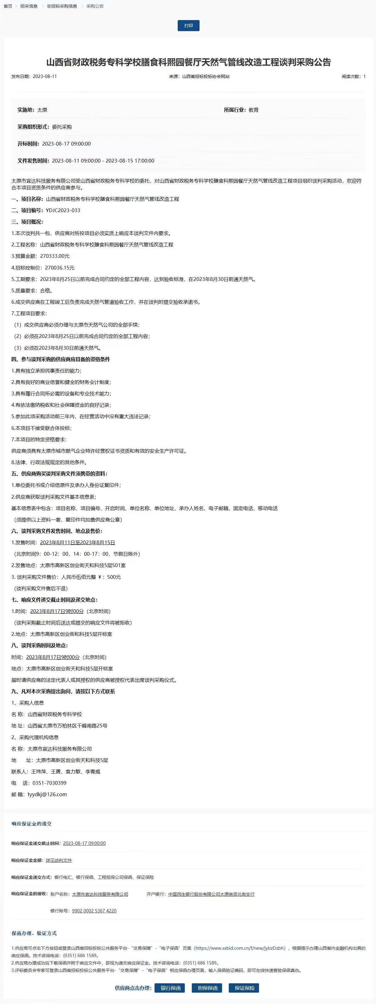 2023年8月11日,太原市宜达科技服务有限公司受bat365委托,对bat365“膳食科熙园餐厅天然气管线改造工程”项目发布了谈判采购公告,山西省招投标网关于本项目的公告如下:
