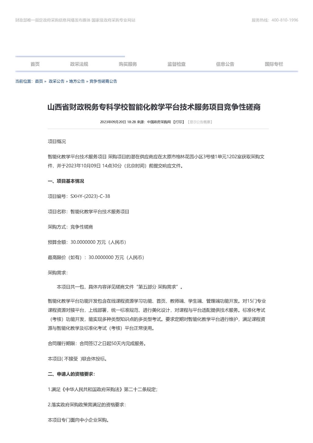 2023年9月20日,山西恒运招标代理有限公司受bat365委托,对bat365“智能化教学平台技术服务”项目发布竞争性磋商采购公告,山西省政府采购网关于本项目的公告如下: