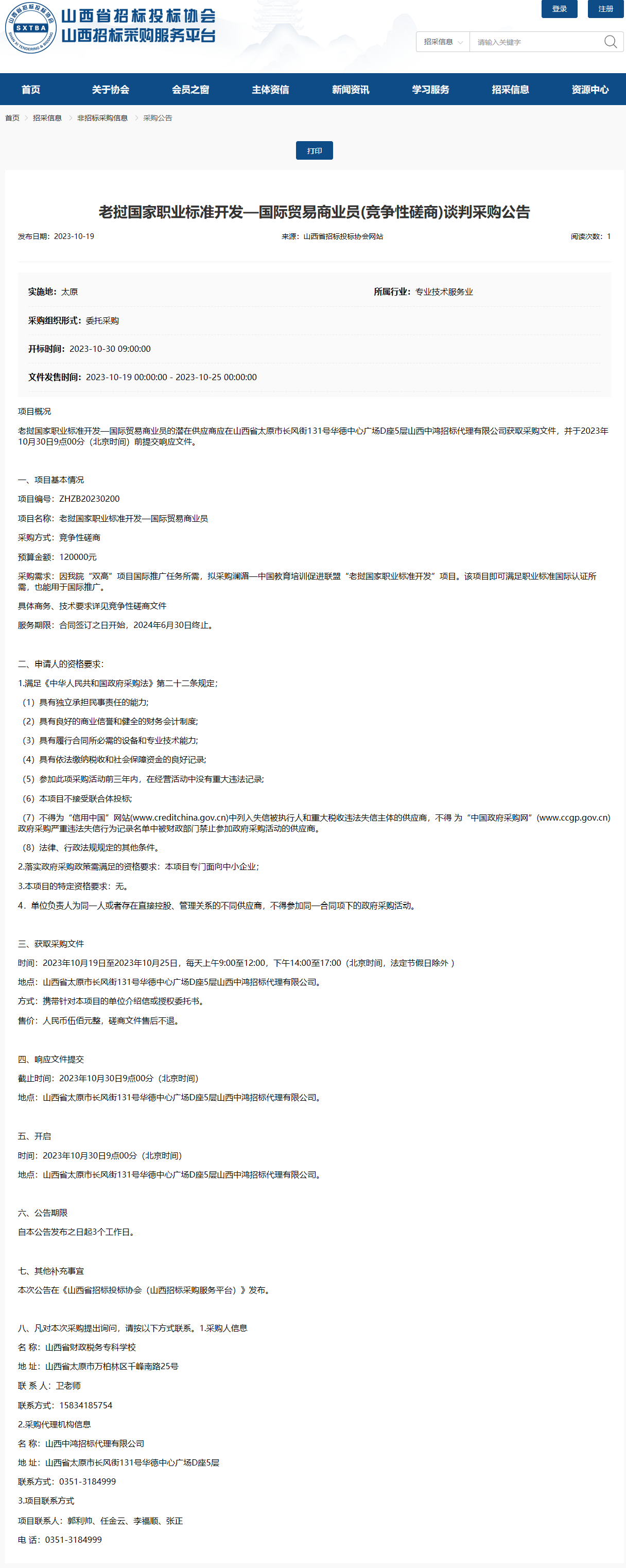 2023年10月19日,山西中鸿招标代理有限公司受bat365委托,对bat365“老挝国家职业标准开发——国际贸易商业员”项目发布了竞争性磋商采购公告,山西省招投标网关于本项目公告如下:
