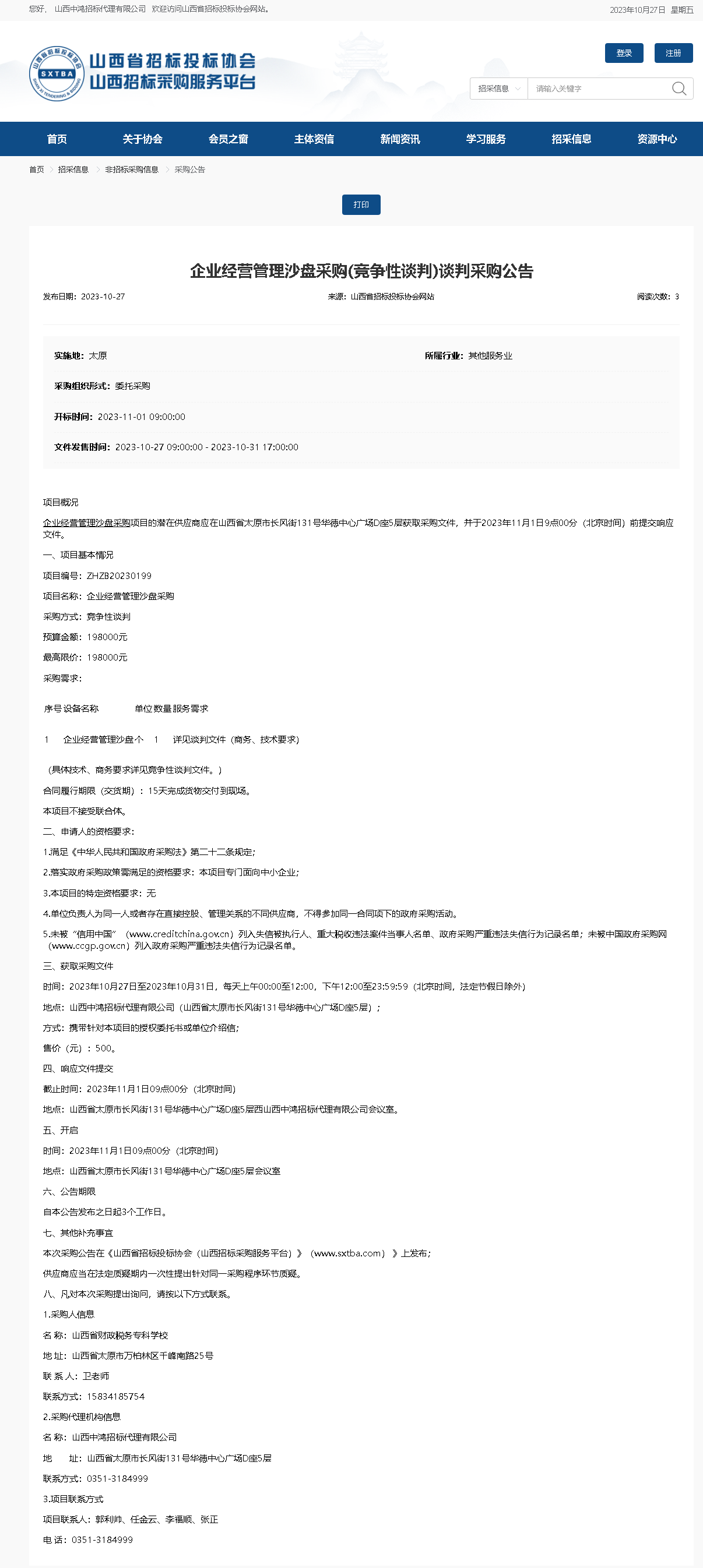 2023年10月27日,山西中鸿招标代理有限公司受bat365委托,对bat365“企业经营管理沙盘”项目发布了竞争性谈判采购公告,山西省招投标网关于本项目公告如下: