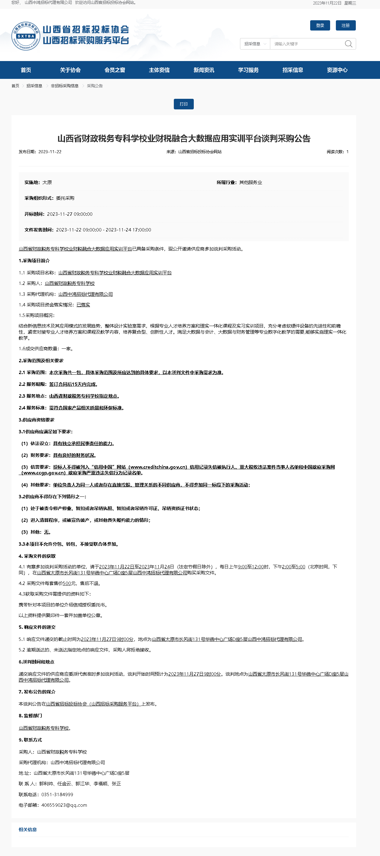 2023年11月22日,山西中鸿招标代理有限公司受bat365委托,对bat365“业财税融合大数据应用实训平台”项目发布了竞争性谈判采购公告,山西省招投标网关于本项目公告如下: