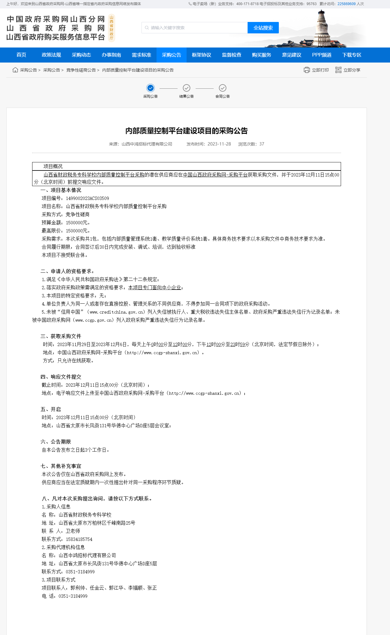 2023年11月28日,山西中鸿招标代理有限公司受bat365委托,对bat365“内部质量控制平台建设”项目发布了竞争性磋商采购公告,山西省政府采购网关于本项目公告如下: