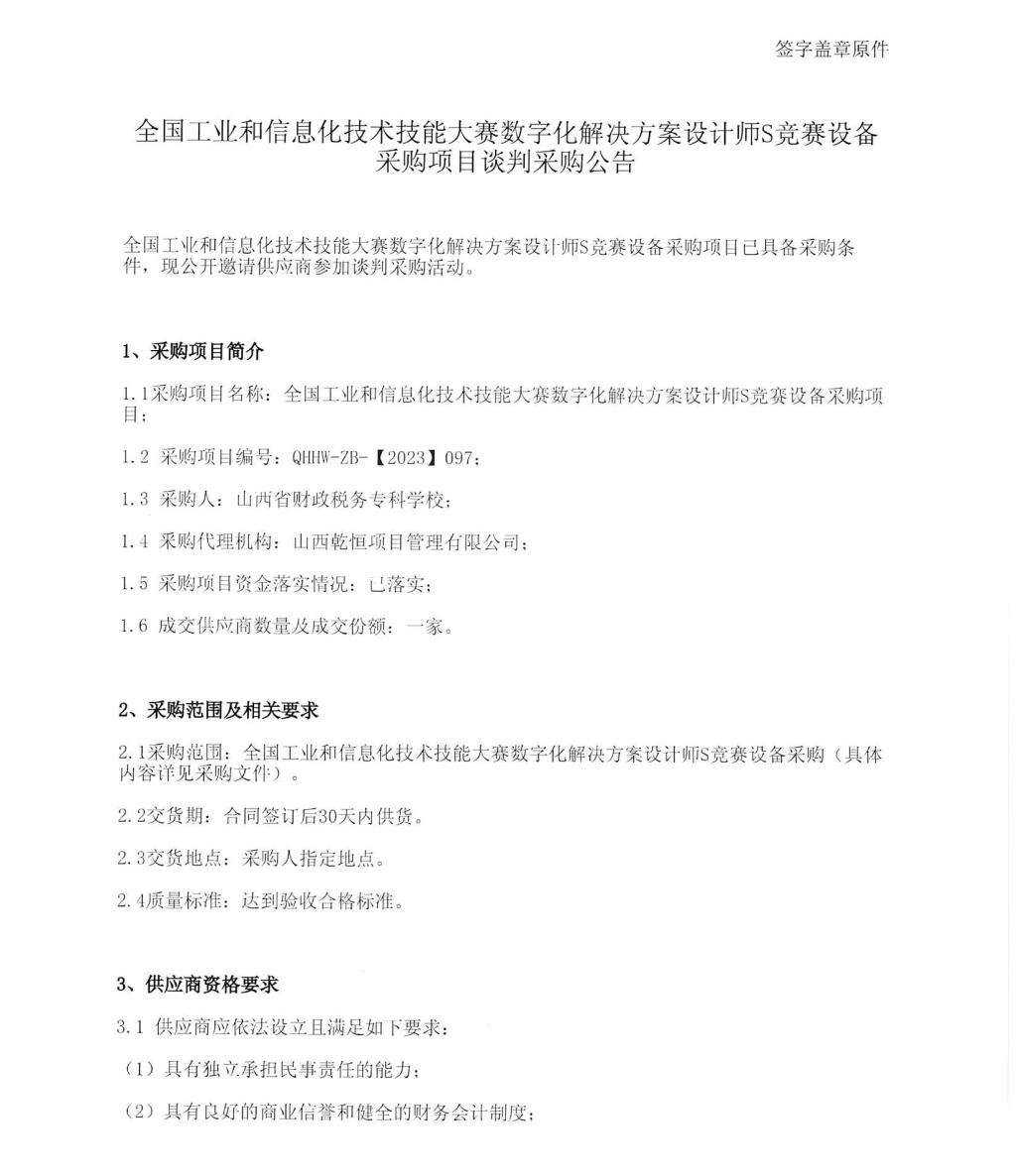 2023年11月30日,山西乾恒项目管理有限公司受bat365委托,对bat365“全国工业和信息化技术技能大赛数字化解决方案设计师S竞赛设备采购”项目发布了谈判采购公告,山西省招投标网关于本项目公告如下: