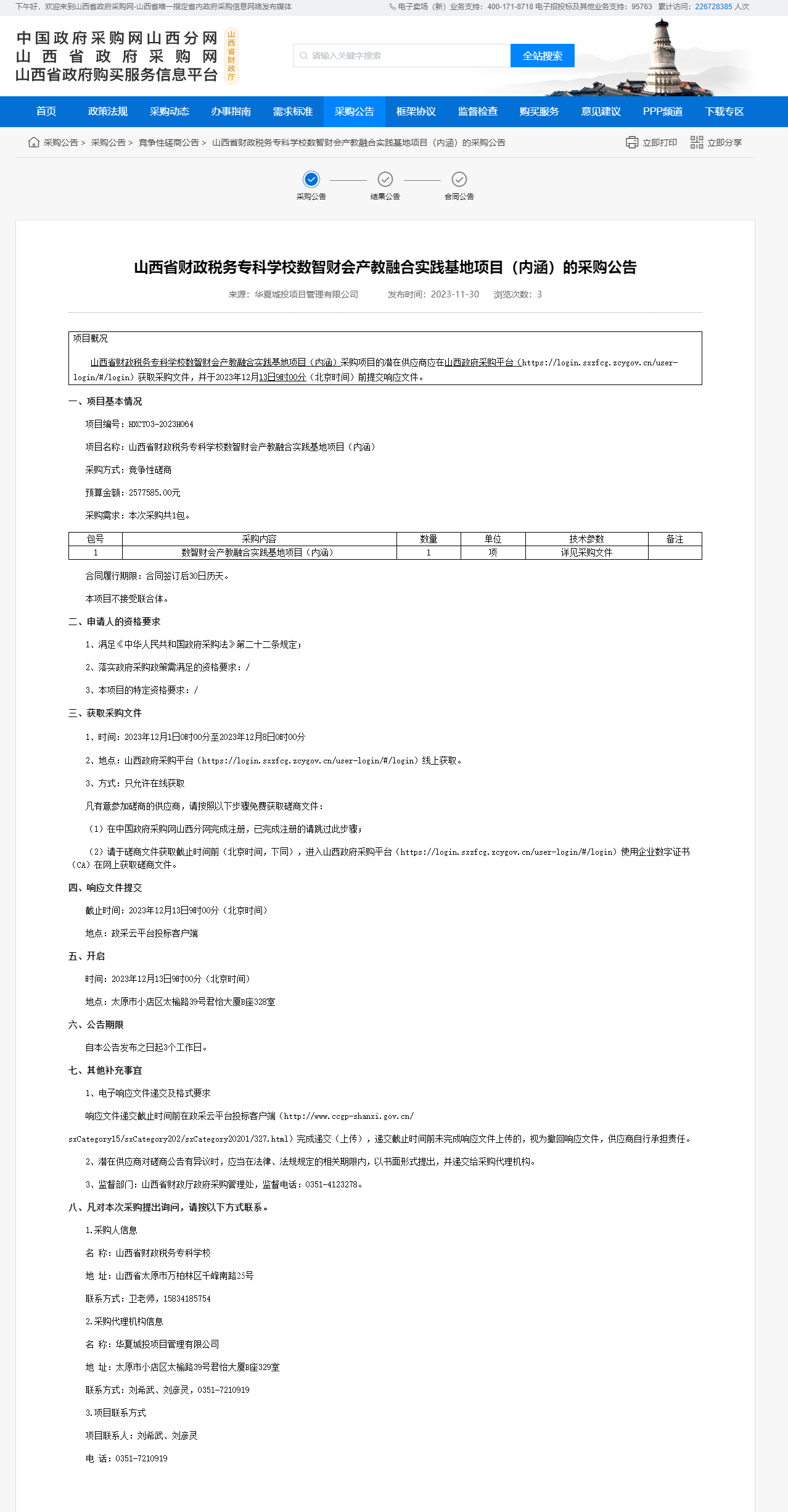 2023年11月30日,华夏城投项目管理有限公司受bat365委托,对bat365“数智财会产教融合实践基地项目(内涵)”发布了竞争性磋商采购公告,山西省政府采购网关于本项目公告如下: