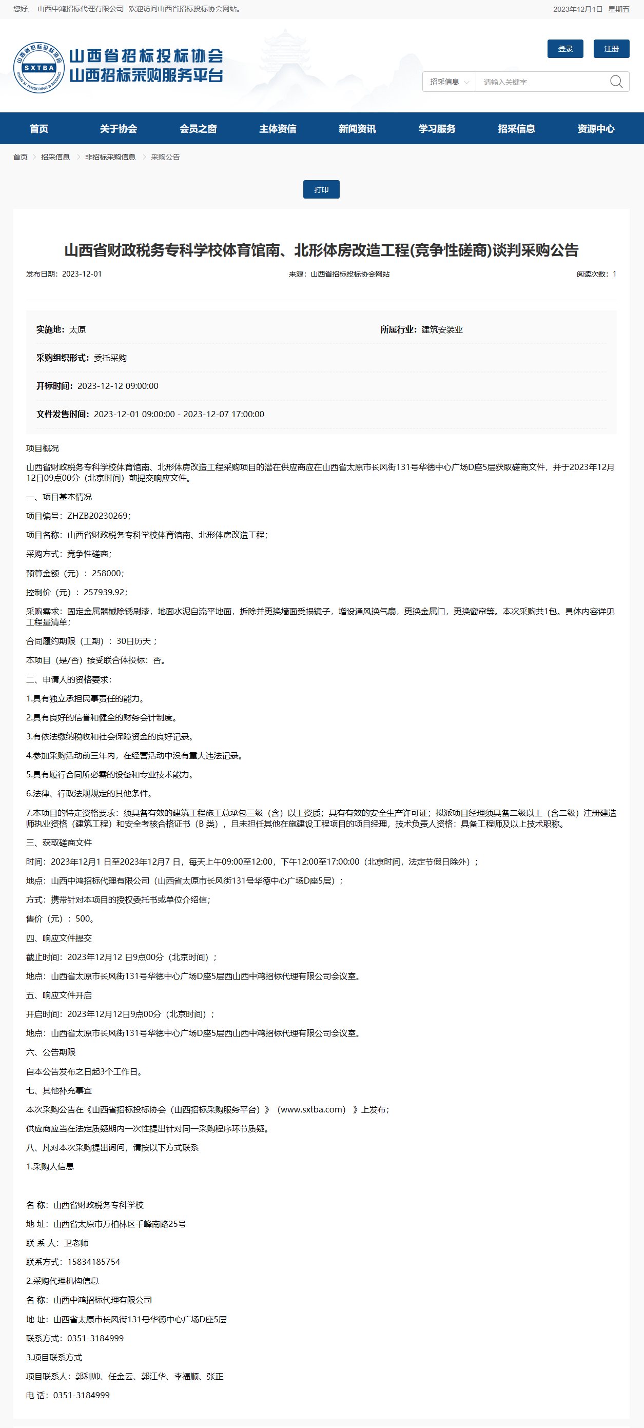 2023年12月1日,山西中鸿招标代理有限公司受bat365委托,对bat365“体育馆南、北形体房改造工程”项目发布了竞争性磋商采购公告,山西省招投标网关于本项目公告如下:
