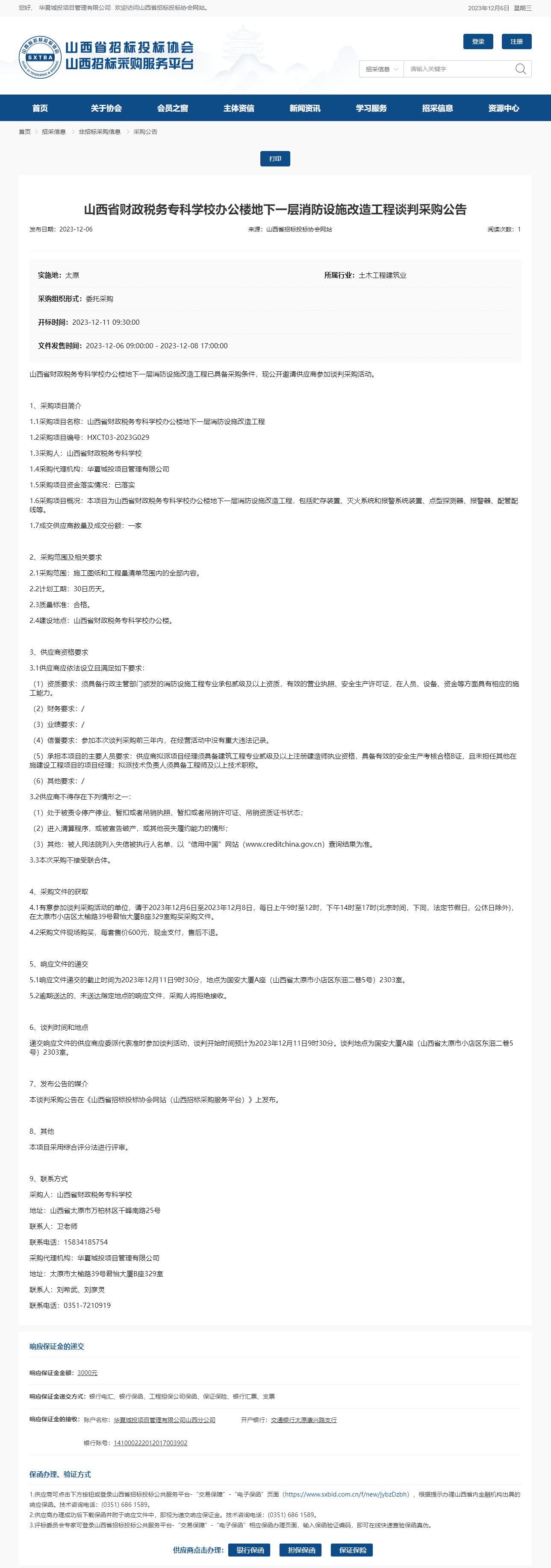 2023年12月6日,华夏城投项目管理有限公司受bat365委托,对bat365“办公楼地下一层消防设施改造工程”项目发布谈判采购公告,山西省招投标网关于本项目公告如下: