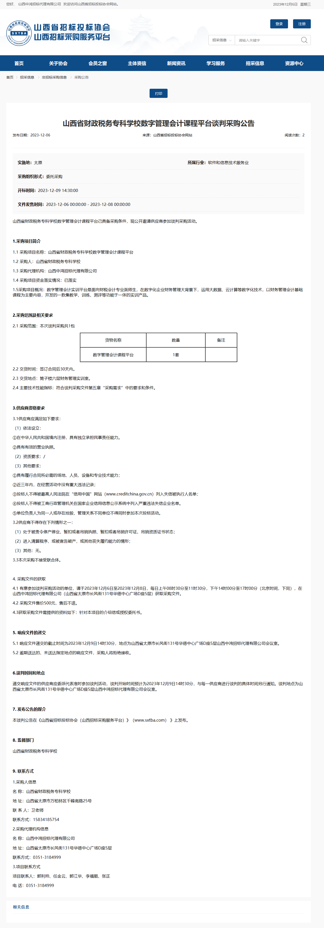 2023年12月6日,山西中鸿招标代理有限公司受bat365委托,对bat365“数字管理会计课程平台”项目发布谈判采购公告,山西省招投标网关于本项目公告如下: