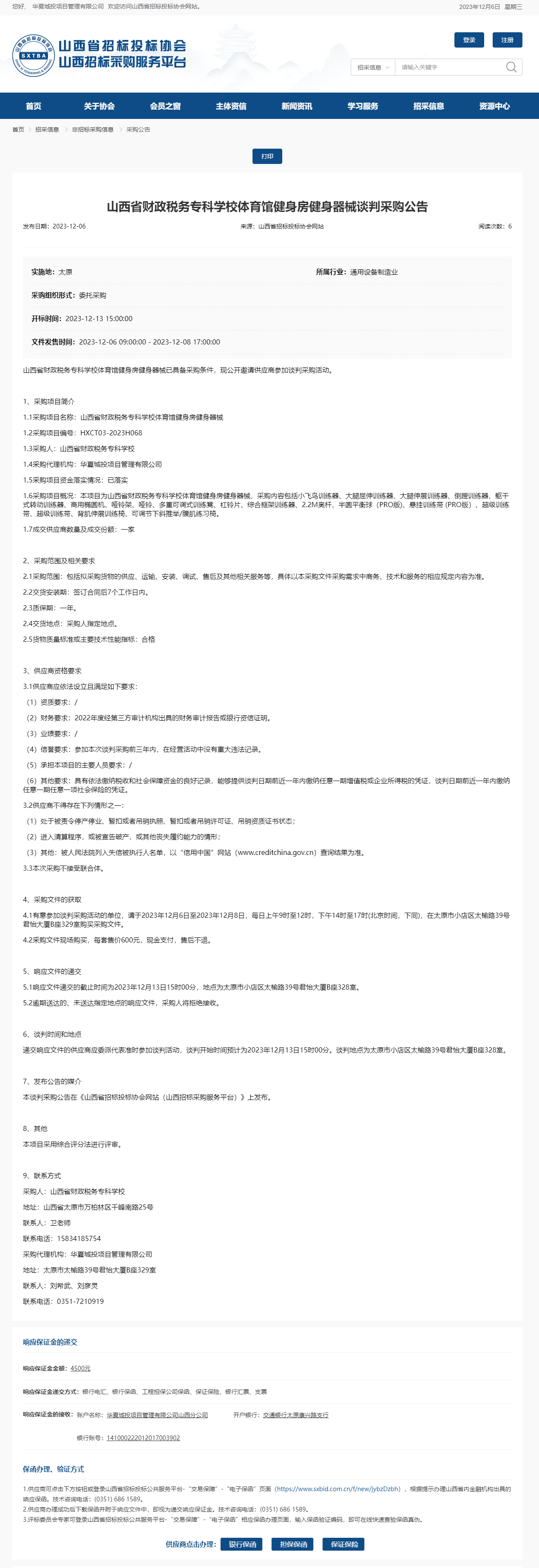 2023年12月6日,华夏城投项目管理有限公司受bat365委托,对bat365“体育馆健身房健身器械”项目发布谈判采购公告,山西省招投标网关于本项目公告如下: